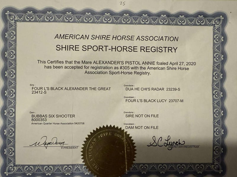 ONLINE-AUKTION Bieten Sie jetzt auf www.PlatinumEquineAuction.com Startgebot: 3.500 USD Auktion endet am 23. November 2025 Benötigen Sie ein neues Sattel? Schauen Sie bei White Rock Saddles auf unserer Webseite oder Facebook vorbei. Es gibt gute Stuten, schöne Stuten… und dann gibt es Blue Bell. Eine im Jahr 2020 registrierte Shire Sport Horse-Stute, die mit 15,2 Hand pure Präsenz zeigt. Sie ist die Art, die einen mitten im Satz zum Anhalten bringt und den Blick fesselt — tiefblaues Fell, große Knochen und das ruhige Selbstbewusstsein, das sagt: Sie hat schon einiges erlebt. In den letzten zwei Jahren war Blue Bell eine echte Allrounderin — sie hat Rinder eingezäunt, Trucks beladen, Zäune überprüft und Paare sortiert. Sie hat einen vollen Arbeitstag gesehen und geht trotzdem mit aufgestellten Ohren zurück zum Anhänger. Sie besitzt den Mut eines Ranchpferdes und die Anmut eines Showpferdes — alles in einem atemberaubenden Paket. Bitte nicht einschränken — Blue Bell reitet sowohl englisch als auch western und hat bereits über Sprünge gestartet, als hätte sie das ihr ganzes Leben lang gemacht. Sie bewegt sich frei und elegant, ist im Maul weich und hat einen Loping, den man in den Sonnenuntergang reiten könnte. Sie wurde zu Rodeos, Ranches und sogar zu den Fort Worth Stockyards gebracht, wo sie den Verkehr, Wagen und das Chaos souverän meisterte. Auf den Trails ist sie die zuverlässige Leitstute, der alle folgen — sie überquert Wasser, Brücken und Dickicht ohne zu zögern und vertraut ihrem Reiter. Im Reitplatz ist sie eine Hinguckerin — mit tiefem Kopf, geschmeidig und stilvoll. Sie geht Schritt, Trab und Longe korrekt, hält eine große Pause und trägt sich mit Stolz. Blue Bell ist im Kern zutiefst liebenswert — die Erste, die dich an der Weide begrüßt, und die Letzte, die sich beschwert. Sie wird verladen, angebunden, beim Hufschmied stehen und kommt überall gut zurecht. Diese Stute besitzt Talent, Temperament und jede Menge Einsatzbereitschaft. Sie ist die Art, die morgens zum Rindern ropen, nachmittags in die Stadt mitgenommen werden kann und sonntags englisch geritten wird. Blue Bell — weil nicht alle blauen Roans gleich sind. Wir laden alle Interessenten herzlich ein, einen Termin zu vereinbaren, um sie persönlich zu sehen, oder bei Unmöglichkeit eine FaceTime-Vorführung zu vereinbaren. Wenn Sie Hilfe beim Transport benötigen, zögern Sie nicht, uns zu fragen — wir haben eine Liste zuverlässiger Transportunternehmen, die sie sicher zu Ihnen nach Hause bringen, weltweit, inklusive Alaska, Mexiko, Hawaii, Kanada und überall dazwischen, aus Stephenville, TX. Kontaktieren Sie Michelle bei M $ Performance Horses unter 661-817-9120 bei Fragen.