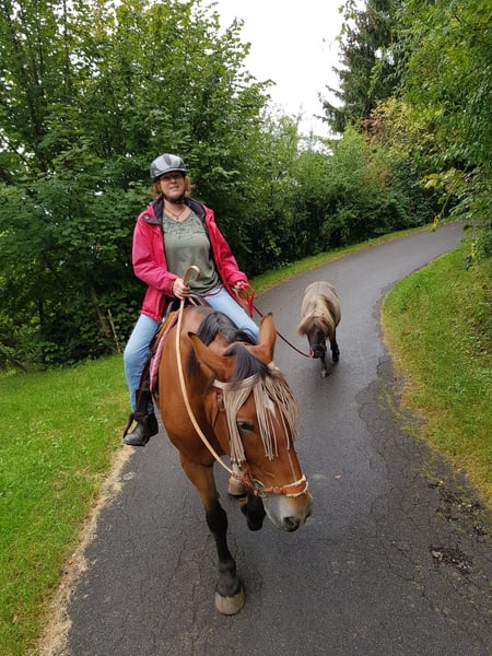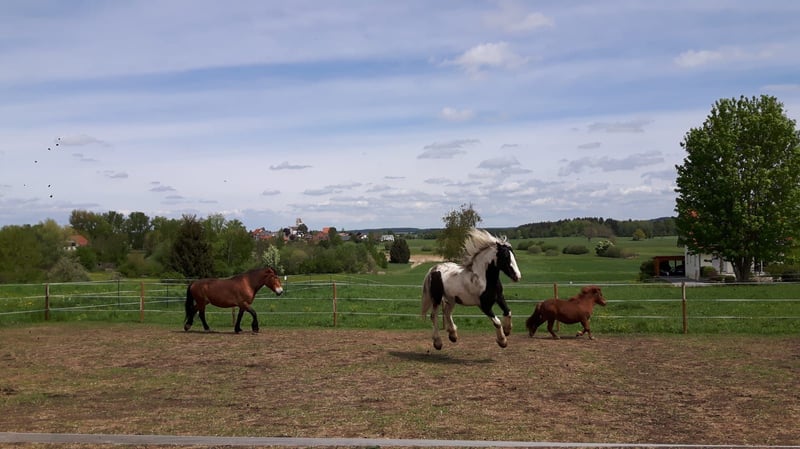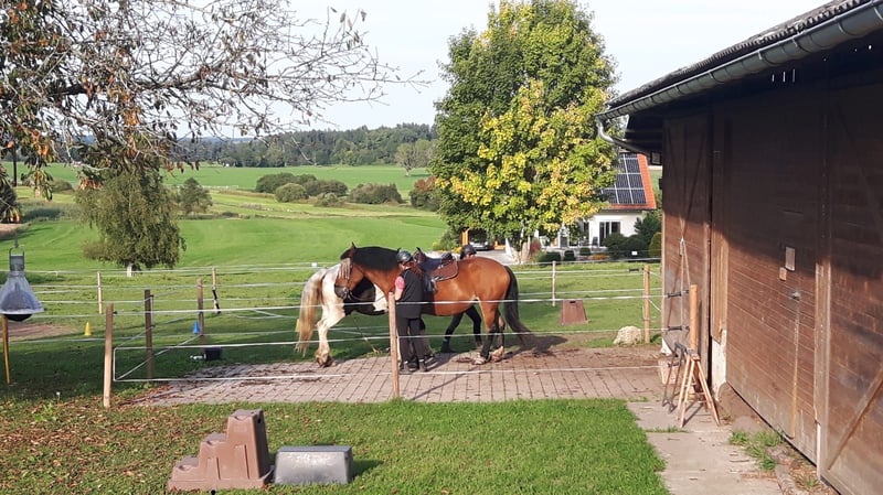 We are selling our two leisure horses. They are only available together. Price per horse includes accessories (matching treeless saddles, bridles, riding pads, blankets, and much more). We have had both horses for 9 years. They have always been healthy and barefoot. They have always been kept in an open stable with 24-hour turnout and hay in paddocks. Our teenage children learned to ride on them, and we always rode in the countryside as a pair. Both have previously been driven in carriages, so they are also suitable for road use. Currently, they have only been kept at our farm for the past 1-2 years, as our children have moved away to study and have given up riding. Therefore, the horses would need some retraining to regain their full potential. They are very people-oriented and are familiar with dogs, chickens, ponies, and donkeys – this has never been an issue. Even our grandchildren have ridden them. They do not bite or kick. Hoof care has been performed every 8 weeks, and they are vaccinated. Age: 16 and 17 years. Height at withers: 161 cm and 163 cm. Videos of lunging available upon request.