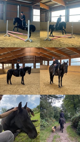 Wir verkaufen schweren Herzens unsere Schlesier x Polnisches Halbblut Stute "Hollywood" von dem Schlesier Hengst "Ego". Sie ist 2019 geboren und hat einen Stockmaß von ca. 155cm. Bereits in ihrem jungen Alter überzeugt sie mit einem coolen, braven und entspannten Wesen. 5-Jährig haben wir sie im Herbst 2024 im Gelände angeritten, danach in die Winterpause geschickt und seit Frühjahr 2025 weiter angeritten. Seit Juli wird sie regelmäßig gearbeitet. Holly ist solide angeritten, beherrscht die drei GGA. Ebenso wurden schon Stangen, Cavalettis und kleine Sprünge in die Dressurarbeit eingebaut. Reitvideos vorhanden. Holly kennt Offenstall- und Pensionsstallhaltung. Sie fährt Transporter und Hänger (unproblematisch beim Verladen). Sie geht alleine und in der Gruppe ins Gelände, ist dabei unter sicheren Reiter:innen (es handelt sich immer noch um ein Jungpferd!) unerschrocken und geht gern voraus. Sie wurde neben dem Gelände in der Halle, Longierhalle, um die Galoppbahn oder auf dem Reitplatz geritten oder gearbeitet. Sie hat Spaß an Longe, Doppellonge, Freispringen, Freiarbeit, Handarbeit, etc. Sie lernt unglaublich schnell und gern. Sie kennt Schenkelweichen, Schulterherein, Übertreten, Ansätze vom Travers, … . Spielerisch hat sie auch Anfänge von halben Tritten angeboten. Sie kennt Hunde, Trecker, etc. Sie kennt es auch gebisslos, mit Reitpad oder komplett ohne Sattel geritten zu werden. Holly wurde ebenfalls schon probeweise von Erwachsenen Anfängerinnen sowie Fortgeschrittenen „Kindern“ (12-18 Jahre) an der Longe und frei geritten. Sie ist sowohl beim Anreiten, als auch in der weiteren Ausbildung brav und unproblematisch gewesen (Videos natürlich vorhanden). Kein Steigen, Bocken oder Durchgehen. Solange die Reiter:innen locker draufsitzen läuft sie schön, wenn jemand klemmt, klemmt sie auch. Unter sicheren und erfahrenen Reiter:innen läuft sie wie ein Uhrwerk, wovon Sie sich beim Vorreiten selbst überzeugen können. Wir können sie uns aufgrund ihres Gemüts als ideales Freizeitpferd (Ausreit-, Kinder- oder Familienpferd) vorstellen, wenn sie an ihre zukünftige Aufgabe mit Sinn und Verstand herangeführt wird. Es handelt sich immer noch um ein Jungpferd, welches weiterausgebildet werden muss. Auch als Kutschpferd oder im Turniersport der unteren Klassen könnte sie glänzen, sie besitzt einen tollen Trab und eine angenehme Galoppade. Sie wird regelmäßig geimpft, entwurmt und barhuf vom Schmied bearbeitet. Sie war seit ihrem 2ten Lebensjahr in unserem Besitz nicht krank, keine Kolik, keine Rehe. Sie hat sich mal eine Verletzung am Hinterbein zugezogen bei der sie NICHT lahm war. Der komplette Behandlungsverlauf liegt vor, aus dem sich ebenfalls ergibt, dass sie nicht lahm war. Diese tolle Stute wird unter Wert verkauft, da sie leider auf beiden Hinterbeinen (links etwas mehr, rechts weniger) seit Geburt an ein Lymphproblem hat. Sie ist dadurch nie lahm gewesen, deshalb haben wir keine speziellen Behandlungsmöglichkeiten ausprobiert. Die Hinterbeine laufen bei mangelnder Bewegung an und schwellen bei Bewegung wieder ab. Wir benutzen nun in Absprache mit dem TA Kompressionsstrümpfe, die helfen, wenn sie sich nicht genügend selbst bewegt. Im Offenstall waren die Hinterbeine stets dünn. Im Pensionsstall ist es deutlicher geworden, da der Anreiz sich auf dem Paddock frei zu bewegen fehlt, wenn sie die ganze Zeit am Heu steht. Wir empfehlen daher aktive Offenstallhaltung oder eine Pensionsstallhaltung mit viel Bewegung und / oder täglicher Arbeit. Sie wird nicht an Pferdehändler abgegeben, am liebsten in private Hände oder eine kleine, liebevolle Reitschule. Wie dem langen Text zu entnehmen ist haben wir Holly sehr ins Herz geschlossen, kennen sie in- und auswendig, versorgen unsere Pferde täglich (mehrmals) selbst und haben ihr einen liebevollen (und nicht zu schnellen) Start ins Reitpferdeleben geboten und hoffen auf ein liebevolles Zuhause (am besten 5 Sterne :-)) damit der Abschied nicht allzu schwer fällt. Preis absolut verhandelbar, Platz vor Preis