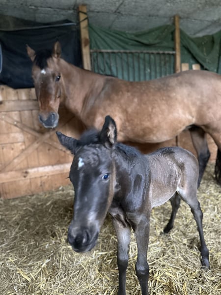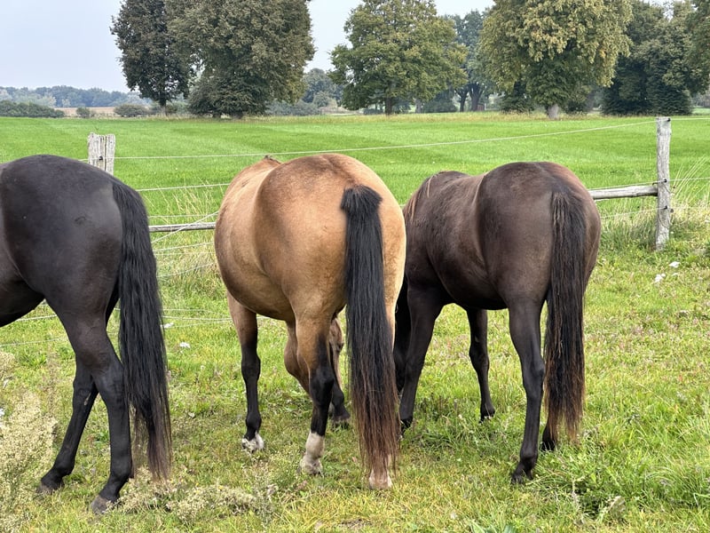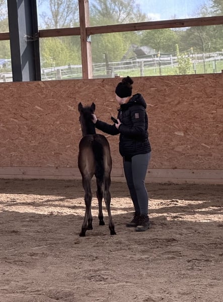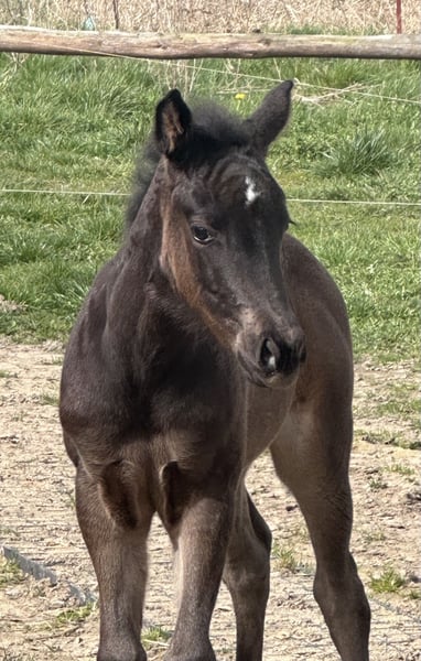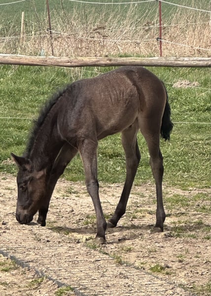 For sale is a stunning American Quarter Horse mare with the interesting color "smoky black," born on March 13, 2024. She currently measures approximately 140 cm at the withers, with an expected final height of around 150 cm. This makes her ideally suited for reining and other Western riding disciplines. The mare impresses with her clarity, fearless nature, and elegant appearance, as well as her promising potential in reining competitions. She is healthy, well-socialized, and has been lovingly raised. Transitioning into a new herd should be smooth. "Joy" is the perfect partner for riders seeking a young horse with great talent. If interested, I am happy to provide further information and additional pictures.