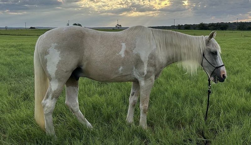"AVAILABLE ON ONLINE HORSE AUCTION AT www DOT MagicHorseAuction DOT com BIDDING OPEN NOW thru TUESDAY | November 11TH! - BUY IT NOW AVAILABLE! *Final price will be determined on auction site* CONSIGNOR CONTACT INFO: Louise Lander 512-461-4972 LOCATION: Marble Falls, TX Chance is a Beautiful, Smooth, Gentle Gaited 15-year-old American Spotted Saddle gelding. Don’t let his age fool you, he has tons of get -up-and -go!! He stands at 15.2 and is the gentle giant. He came from an owner of 8 years and obviously was well cared for and very well trained. He has all the accolades one would look for in a horse. Ground manners: He is quiet and calm when tied, and I usually only need to ground tie him because he stands where I leave him. (seen in my videos) Loves grooming, great for the farrier and vet. He has had his teeth floated twice since I’ve had him. The farrier has come every 6 weeks for the entire year since I’ve had him too. (Natural hooves) He loads and travels wonderfully( quiet, and very patient). He will stay tied for any amount of time. He usually follows me with out a lead when finished riding and will follow me to the tack area where I take off his tack.(as seen in video) Round pen: He lunges with a lead and without a lead. Walks or gaits when cued. He will come to you and follow one around the arena w/o a lead. Backs up on cue as well. (seen in video) I have taken lessons with him for many months to help improve my riding knowledge. He has been patient with me . He knows leg pressure and is versatile with direct and neck rein. He knows one rein stop. Backs up calmly and moves hind quarters and fore quarters well. I have done a few obstacles (logs, tires, going between cones and stepping over bars and through hanging sheet and noodles. General information: He is not bothered by pistol shooting( shot balloons off of him too), flags, umbrellas, carrot stick slapping on the ground, or balls. He has been around farm equipment and dogs and is fine around all of it. He was used for trail riding and camping by his previous owner. I have only ridden on trail with him in groups, and he does well in any position (lead, middle, last). He stands well for mount and will rack out as well if needed. He walks off with loose rein or will wait patiently until cued to move out. He has a smooth-running walk and smooth gait. (seen in multiple videos). Most importantly, he has a sweet disposition and in great health. I wanted to grow old with him, but due to some recent family health obligations, I cannot keep him. I even bought a new trailer for him and a new saddle. I truly wanted him to be my forever last horse. However life sometimes can take one on a different path not planned. He loves apples and carrots, which I give him often. At put-up time and feeding time, all I do is call him, and he comes running and goes straight into his stall and stands right in front of his trough. He will wait till I get there. It’s really so heartwarming. He also loves his fly mask, which I will send with him. (I also have a Circle Y Topeka Trail Flex 2 padded western saddle sz.15 seat that’s available for sale if interested, fits him very well). I will also send the two different bits I have used, if anyone would like that they are available . He is an easy keeper and would make a great companion on the trail and arena lessons as well.I would also recommend an experienced rider as well. He is also UTD on all vaccines.