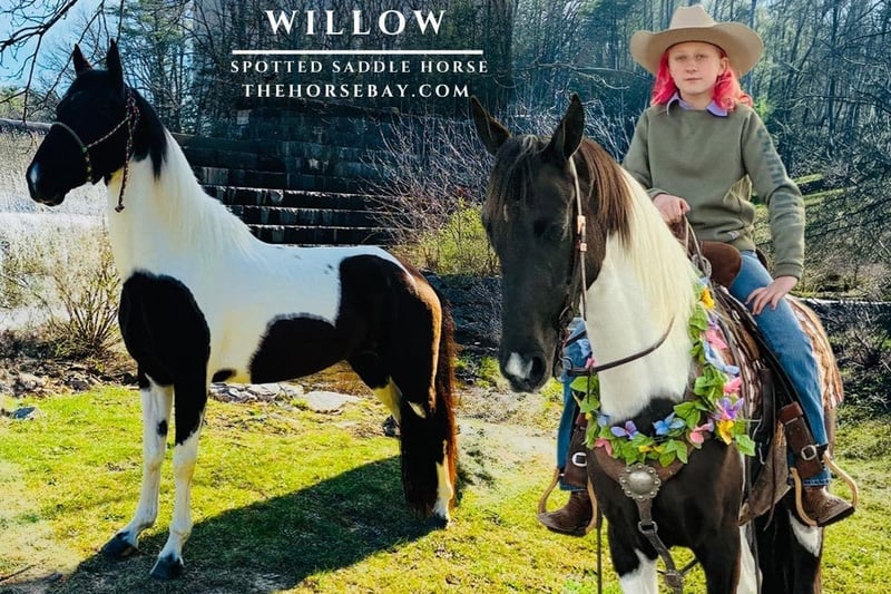 I would like to take a moment to introduce you to Willow. Willow is a gorgeous 15-hand black and white Spotted Saddle horse Mare. Willow was born and raised on the same farm where she has been handled and loved since day one. Willow is a special girl looking for a special home. Willow has a nice smooth natural gait that is hard to find, if you’re looking for a gait that doesn’t bounce you and is comfortable to ride for hours, she has it. I have to mention that if you like to canter, Willow has a beautiful, fun canter and will pick up her leads in both directions of the arena if you ask her, and will willingly canter out in the open. Willow has been to fun shows and extensively trail ridden. Willow rides on the road and has no problem with traffic. Steep rocky terrain? No problem, she is very sure-footed, pays attention, and takes you wherever you ask her to. No mountain seems to be too steep for her; she crosses ditches, water, logs, and rocks. If you want to relax and walk the trails for hours, that’s fine by her. Willow stands quietly tied; she does well in crossties or just normally tied. She is very easy to catch, is great at handling her feet, tacks, and loads with ease. Willow rides comfortably in a group. l have ridden her out alone a lot and she is a champ about it, l have had no issues along the way ever. My 12-year-old niece occasionally rides bareback, without a bridle. Carrying the flag with her at a canter with no hands is her absolute favorite thing to do with her, and Willow loves it! We have had her pastured as well as in the stall when the weather isn’t cooperating, and she does great with both. She isn’t bossy and gets along with everyone. If you’re looking for a loving, well-minded, amazing gait, beautiful, kind, lifelong companion and trail partner, Willow will make a phenomenal horse for you. This mare aims to please and loves to ride. Come see Willow and learn more.