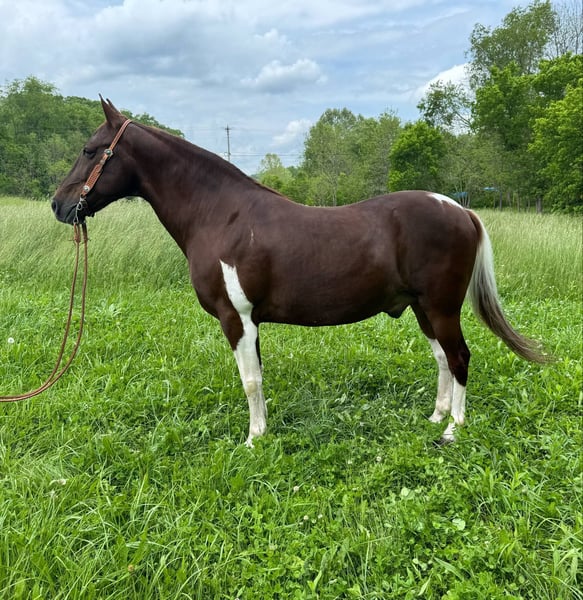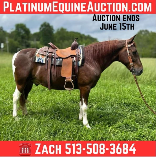 ONLINE AUCTION Place your bids at www.PlatinumEquineAuction.com Starting Bid $3500 Auction ends June 15th, 2025 Need a new saddle? Check out White Rock Saddles on our website or Facebook! Rocky is a gorgeous chestnut and white Tennessee Walking gelding. Rocky is 8 years old and stands 15 hands tall and has a very sturdy build. Rocky is a been there and done that seasoned trail horse with miles and miles of experience on the trails. He will cross creeks, ditches, logs, deadfall, rocky surfaces and scale steep slopes. He is easy to ride and enjoys his job. Rocky has a super smooth gait that anyone will appreciate! He loves people, is everyone’s best friend and really aims to please. He is located in Moscow, OH. Contact Brandenburg Stables Zach 513-508-3684 to make a Buy It Now Offer, to schedule a time to come look at him or if you have any questions. ONLINE AUCTION Place your bids at www.PlatinumEquineAuction.com Starting Bid $3500 Auction ends June 15th, 2025 Need a new saddle? Check out White Rock Saddles on our website or Facebook!