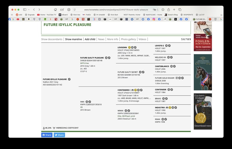 ZUKUNFTS IDYLLISCHER GENUSS – ein 4,8 Jahre alter Wallach, gezüchtet für den Vielseitigkeitssport. Er ist sohn von Future Guilty Pleasure (Levisonn/Levisto Z/Cantoblanco/Canto) und seine Mutter, Iniki, stammt ab von Contendro/IIndoctro/Capitol I. Im Jahr 2021 wurde er Vice-Champion der Vielseitigkeitspferde bei der British Futurity. Er ist gut gebaut, verfügt über drei schöne Grundgangarten und hat eine sehr menschenfreundliche Natur. https://www.horsetelex.com/.../future-idyllic-pleasure