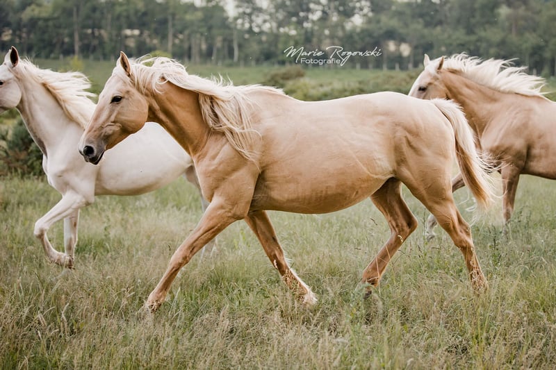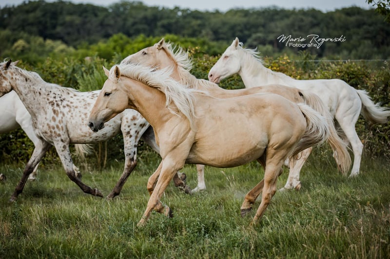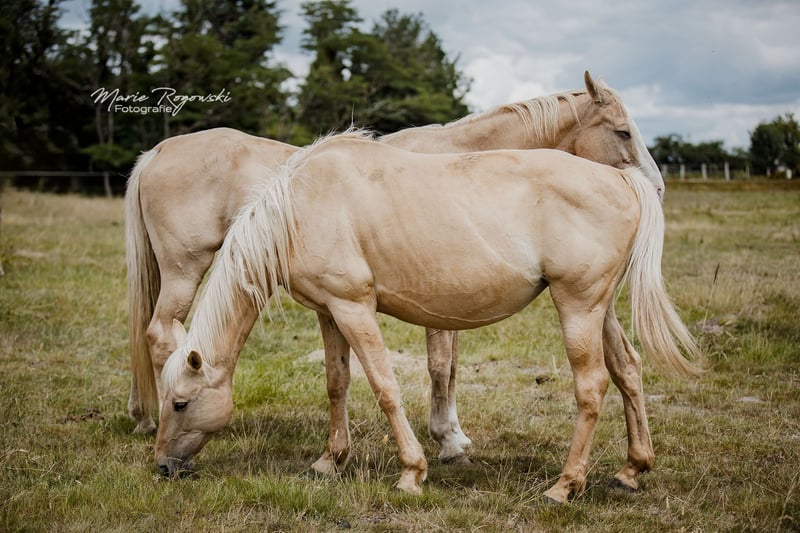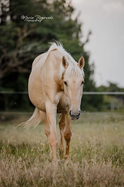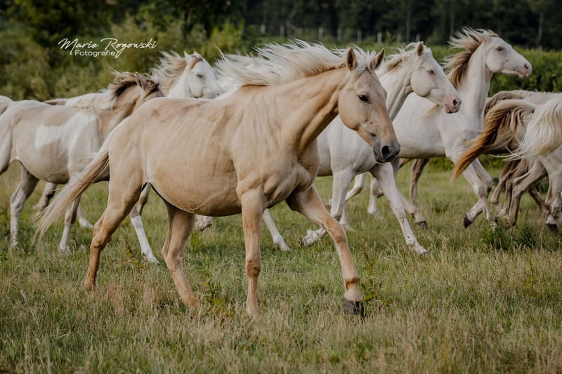 Paard uit Duitsland | Dunalino (e/e, Cr/n, D/n) | Geboren in 2015 | 1,56 m FABULA GF is een opvallende merrie met een sportieve afstamming en zeldzame genetica: zij draagt zowel het Cream- als het Dunalino-gen. Haar vader is de uit Canada geïmporteerde en veel erkende vollebloedhengst TCF Palladium xx, die als eerste Smoky-Cream vollebloed in Europa heeft gefokt. Haar moeder, Funny Girl, is een van de weinige Dunalino warmbloedmerries met papier, waarmee ze doelgericht kleur combineert met een solide fundament. Fabula is van nature wat terughoudend naar mensen toe en heeft tijd nodig om vertrouwen op te bouwen. Ze staat in een open stal, is vertrouwd met de dagelijkse routines en gedraagt zich onproblematisch in de kudde. Vanwege haar genetica is ze bijzonder geschikt voor de fokkerij van kleurrijke, sportgericht gereden paarden.