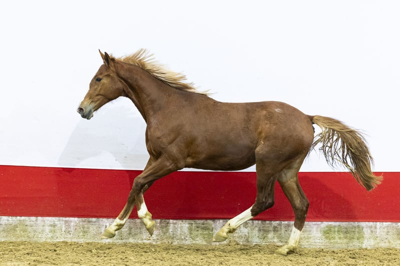A very distinctive mare with her striking blonde mane. She immediately stands out in type and presence. Beautifully long-lined, modern in conformation and very light-footed in her movement. She has a big, ground-covering canter, is quick off the ground and shows excellent hind leg technique. In her movement she demonstrates an active hind leg and natural balance. A modern sport type with quality and attitude. From the same dam, two embryo offspring are currently successfully competing in sport. The dam herself was a very promising young horse but entered breeding after an accident. Her offspring are already competing at 1.40m level at seven years of age. This makes this mare not only sport-wise interesting, but also extremely valuable for breeding.
