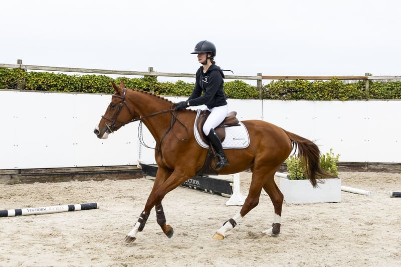 Horse with a lot of overview at the jump and a consistent way of jumping. Shows a good attitude and picks up the work well, despite being only one month under saddle. Shows good technique and scope and jumps consistently. Interesting as a showjumping horse with additional potential towards a hunter career. Sire Colorit – 1.60m level. International showjumper and proven sire with offspring at 1.60m level such as Carlson 86 and Concordia 49. Dam I.Adermie – 1.10m level. Damline Granddam V.Adermie 13 – 1.30m. From this line come: Athena – 1.50m Enjoy – 1.60m Jandino – 1.55m Pumuckl – 1.50m Kensington – 1.50m Additionally multiple horses at 1.45m, 1.40m and 1.35m level. Approved stallion: Arthos R – 1.60m.