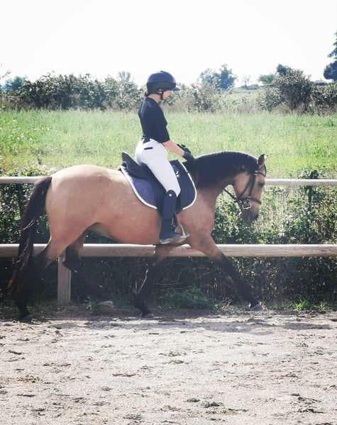 We present to you Championne du Coussoul, an elegant 7-year-old pony mare registered with the AES studbook. She is a cross between a German Riding Pony and a Lusitanian, making her perfect for versatile riding activities, from dressage to leisure riding. Her sire: Champion Suprême d’Été – A stallion with outstanding sporting qualities and a remarkable conformation, regularly recognized for his presence and genetics suited to dressage discipline. Her dam: Amphore du Coussoul (by Mistral du Coussoul) – A well-established maternal line known for balance, comfort, and a high-quality mental attitude, with Lusitanian genetics passed on to her offspring, contributing finesse and a strong connection with the rider. Championne du Coussoul measures 148 cm, with a fine and harmonious build. She was backed in 2023 after her first foal, and has since shown steady progress under saddle, displaying a willing temperament. Very comfortable to ride, she suits both experienced riders and a family environment, thanks to her excellent rapport with humans. She is very close to people, respectful, and exhibits a particularly gentle demeanor around children. Currently, she is training in dressage and also works in free movement and lunging, demonstrating great responsiveness and generosity. She lives in a paddock, barefoot, in perfect health. She has undergone a veterinary examination and radiographs with no issues. She travels very well in a trailer and has not competed yet, simply due to lack of opportunity, but she possesses all the necessary qualities. With her exceptional temperament, comfort, and versatility, Championne du Coussoul is an ideal mare for a pleasure project or guided progression, built on a strong foundation of trust.