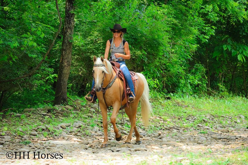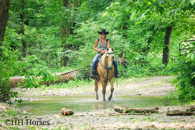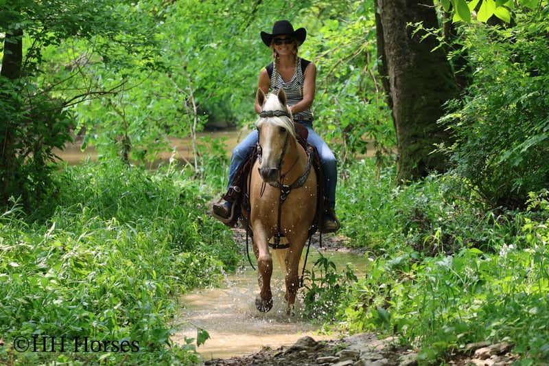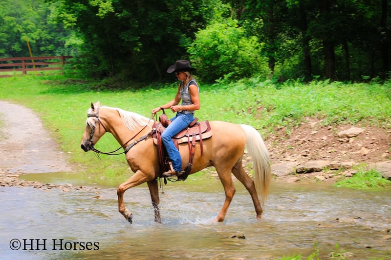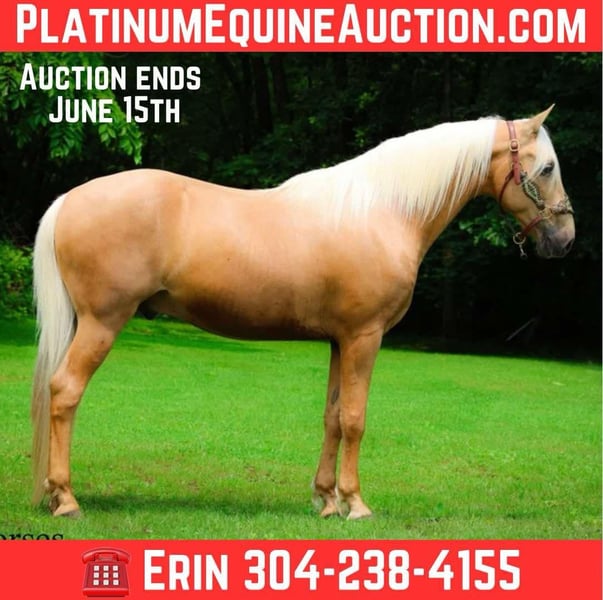 ONLINE AUCTION Place your bids at www.PlatinumEquineAuction.com Starting Bid $3500 Auction ends June 15th, 2025 Need a new saddle? Check out White Rock Saddles on our website or Facebook! This is “A Golden SUNBEAM”, one of the coolest, smoothest, and fanciest GOLDEN PALOMINO KENTUKCY MOUNTAIN GELDINGS around! He is well broke, extra handsome, and super fun to ride. He is 9 years old and stands 15 hands tall. He is very well built and has an attractive way of traveling. He has been out in the pastures to check cattle, in the mountains, and in the thick timber. He is sure footed and has lots of heart. He has a nice 4 beat gait, a super smooth collected canter, a solid stop, and a ONE HAND NECK REIN. He is a solid and seasoned trail mount that will go anywhere you point him without hesitation. He is brave and confident in the woods and will cross any depth of water. He rides on a loose rein and will only go as fast as asked of him. He is traffic safe, been in holiday parades, and hauled to the open shows. He has been shown in country pleasure and always catches the judges attention with his gorgeous color, suave movement, long mane, tail, and foretop. He is as fancy as they come and will ride for any level rider. He rides off in new surroundings quietly and is not afraid of wildlife, commotion, or lots of activity. He will ride in a group and has been on large, organized rides. He will ride in the front or the rear and doesn’t get hot. He’s a real special gaited gelding with color, shape, build, and ability. Call H&R Horses Erin 304-238-4155 to make a Buy It Now Offer or for more info. Located in Flemingsburg, KY. ONLINE AUCTION Place your bids at www.PlatinumEquineAuction.com Starting Bid $3500 Auction ends June 15th, 2025 Need a new saddle? Check out White Rock Saddles on our website or Facebook!