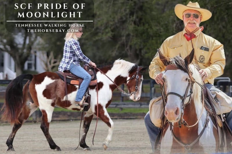 SCF Pride of Moonlight, or JW as we call him, is a 12-year-old going on 13, 16-hand Tennessee Walker. He is very solidly built with a great confirmation. JW is one of the most striking horses I have ever seen and reminds me of a Bev Doolittle painting. JW is a very nice boy and is at the bottom of the pecking order in our stables. I would classify him as a number 3 in terms of temperament. JW excels on long trail rides but could care less for arena work. JW is great for the Ferrer and trailer loads nicely. JW is not a cribber and has never gone lame or had colic. JW has strong bones and great feet. We have never gone down due to poor judgment or lack of strength. I have covered over 400 miles of the Arizona Trail on him and could not ask for a better horse. JW is a local hit by carrying flags in the local parade or mail in a pony express reenactment. JW had his teeth done in January, and a fresh Vet health check on 4-11-26. JW has been on many camping trips and is fine-tied to a tree or high-lined. I have used hobbles on him, but not for over an hour, usually at lunchtime.