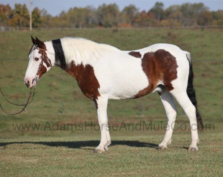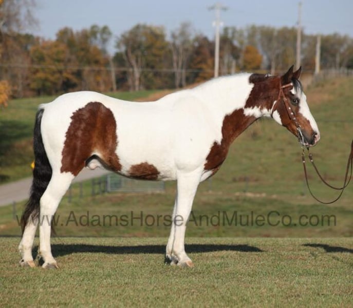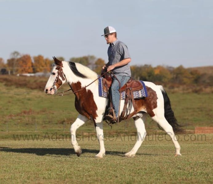 Go to www.AdamsHorseAndMuleCo.com for more pics and a video. AHAMC has been in the horse business and sold horses over the internet since 2005. We have a long track record of success with hundreds of happy customers. We work hard to match riders with the correct horses and specialize in beginner safe, family friendly horses that have been used and checked out by our family! Meet Yancy… He is as cool as the other side of the pillow! Yancy is a well built 14.2-14.3hh, 11 yr old, Bay Tobiano Gelding!!! Yancy is a trail riding machine as he is on autopilot as he goes down the trails. He has been trail ridden in multiple states along the east coast by all levels and ages of riders. He has been trail ridden by our 6 year old and he is the perfect gaited horse to help build your confidence levels! Yancy is very smooth in all gaits! He will flatfoot walk on a loose rein as long as you like or he can move on out if you asked. No matter where he goes or what he does, Yancy is not spooky acting. On the trails he is always great and plenty of experience! Yancy has been exposed to all kinds of wildlife such as deer or turkey or other animals like cows or dogs and will go anywhere that he is asked too. He has been ridden many miles in the mountains of Eastern Kentucky and encountered every obstacle possible on the trail. He will go up or down even the steepest slopes, across deep creeks, over downed trees, and over all types of rough terrain while still being sure footed. He has been rode in traffic, and is very traffic safe around cars, semi, log, and dump trucks. He has a great attitude about whatever he is asked to do and is always willing. If you need one that will take care of you and build your confidence levels, Yancy is the guy for you!!! Feel free to call Eric 606-308-2461 with any questions.