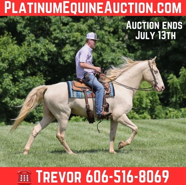 ONLINE AUCTION Place your bids at www.PlatinumEquineAuction.com Starting Bid $3500 Auction ends July 13th 2025 Need a new saddle? Check out White Rock Saddles on our website or Facebook! It’s 5 o’clock somewhere, and around Margaritaville, it’s always 5 o’clock! Let the good times roll as you cruise down the trails on Margaritaville! He is an eye-catching Cremello, Kentucky Mountain Saddle Horse gelding, standing around 15.2 hands high, and is 14 years old. Margaritaville has been owned by a husband and wife for the last few years, who loved to hit the trails on weekends, go camping, and have fun with all their friends. He will picket line tie and trailers well, and he has been hauled to state parks. He will flatfoot walk on a loose rein, or he can move on out if you ask. He has a smooth and natural 4-beat gait that anyone will enjoy riding on! Margaritaville has been shown at local fun shows and has seen it all, from the bright lights to hearing those blaring loudspeakers. He has been exposed to a wide range of wildlife, including deer, turkeys, and other animals like cows and dogs, and will go anywhere he is asked to. He has ridden many miles in the mountains of Eastern Kentucky and encountered every obstacle possible on the trail. He will go up or down even the steepest slopes, across deep creeks, over downed trees, and all rough terrain while still being sure-footed. He has been riding in traffic and is very traffic-safe around cars, semis, logs, and dump trucks. If you’re looking for a safe and enjoyable time, then look no further! Feel free to call Trevor Patrick 606-516-8069 with any questions, to make a Buy It Now Offer or to set up a time to come see him in Parkers Lake, KY. ONLINE AUCTION Place your bids at www.PlatinumEquineAuction.com Starting Bid $3500 Auction ends July 13th 2025 Need a new saddle? Check out White Rock Saddles on our website or Facebook!
