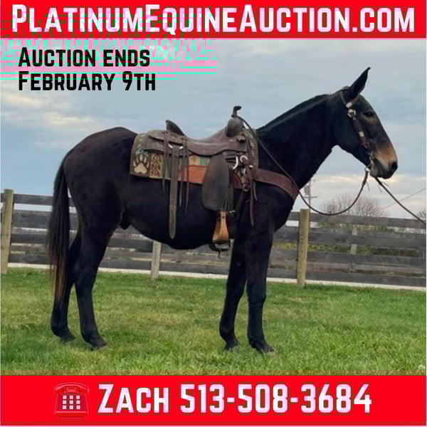 ONLINE AUCTION Place your bids at www.PlatinumEquineAuction.com Starting Bid $3500 Auction ends February 9th, 2025 Need a new saddle? Check out White Rock Saddles on our website or Facebook! Earnie is a one of a kind gaited mule. He is undoubtedly the brokest, handiest, smoothest mule I have ever had in my barn. This mule is absolutely incredible, just watch the video and let him speak for himself. In the video you’ll see Earnie riding at a walk on a very loose relaxed rein, you’ll see him gait and lope, this mule’s gait is awesome, and his canter will make your mouth water, is collected, correct and uncomplicated to ride. He is traffic safe, used to trail dogs and will ride in groups of any size or out alone with ease. This mule is easy to handle, no problem for the farrier and just flat out easy to be around. He will neck rein, ride bridleless and back up. Staying true to a mule’s reputation, he is sure footed and very confident on the trail. Earnie is 15 years old, stands 14.3 hands and easy to brag on! Located in Moscow, OH. Contact Brandenburg Stables Zach 513-508-3684 with any questions. ONLINE AUCTION Place your bids at www.PlatinumEquineAuction.com Starting Bid $3500 Auction ends February 9th, 2025 Need a new saddle? Check out White Rock Saddles on our website or Facebook!