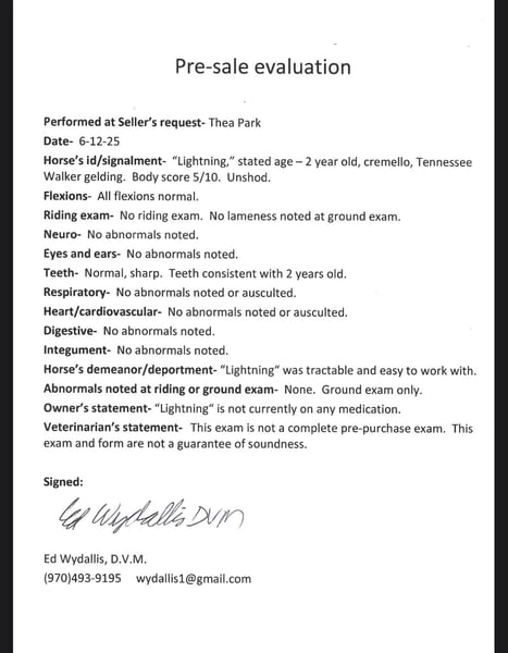 "AVAILABLE ON ONLINE HORSE AUCTION AT www DOT MagicHorseAuction DOT com BIDDING OPEN NOW thru TUESDAY | JULY 22nd - BUY IT NOW AVAILABLE! *Final price will be determined on auction site* CONSIGNOR CONTACT INFO: Dynamite Horses 970-632-3644 LOCATION: Fort Collins, CO ⚡️ Lightning — coming 3 Year-Old Tennessee Walking Horse ⚡️ Meet Lightning, a flashy young Tennessee Walking Horse gelding with a heart of gold and a personality that lights up the whole barn. At just two years old, Lightning already shows the maturity, reliability, and willingness of a much older horse. We’ve raised him since he was a baby, and he’s been nothing short of a joy every step of the way. From day one, Lightning has had the most lovable, goofy personality. He’s the first to greet you at the gate and is always eager to hang out, explore, or just be part of whatever you’re doing. He’s a classic “puppy dog” type—curious, friendly, and genuinely enjoys being around people. Whether he’s playing with toys in the pasture or trying to follow you into the tack room, this gelding thrives on connection. Under saddle, Lightning has proven himself to be a steady, honest, and incredibly safe young horse. He’s never bucked, reared, or bolted. His calm and curious nature has made him a wonderful partner for all sorts of exposure and training. He’ll cross or carry tarps, ride confidently with a flag, drag objects, and has had ropes thrown off him. He’s even pushed calves around and carried young riders for their very first riding lessons—always with patience and care. Lightning moves with a naturally smooth, comfortable gait and knows how to canter as well. His groundwork is extensive, and he’s well-versed in liberty work—responding to voice commands to back up, spin, side-pass both toward and away from you, and more. He’s learning to ride off leg pressure, will confidently go in just a neck rope, and loves bareback rides. He’s also been introduced to English tack and looked downright dashing while going over poles. While Lightning could truly go in any direction—liberty, show, English, Western—his heart is on the trail. He’s happiest exploring new places, and he’s done plenty of it. He’s confident riding out alone and equally steady in a group, whether he’s leading, following, or in the middle. He respects other horses’ space, takes everything in stride, and doesn’t spook at the usual suspects: dogs, runners, strollers, bicycles, or traffic. From rivers and lakes to bridges, tunnels, and even the hustle and bustle of downtown Fort Collins at night, Lightning takes it all in with a relaxed curiosity. He has gone absolutely everywhere we’ve asked him to and enjoys the journey every time. He’s the kind of trail partner you look forward to riding—dependable, willing, and fun. This gelding comes from great stock. I owned his dam, who was just as trustworthy and kind as he is. She was a beloved go-to for kids, guests, and trail rides at our barn, and Lightning is following perfectly in her footsteps. If you’re looking for a young horse with a bombproof brain, fun-loving attitude, and all-around potential, Lightning is the one. He’s a family horse in the making and a trail partner you’ll never want to leave behind.