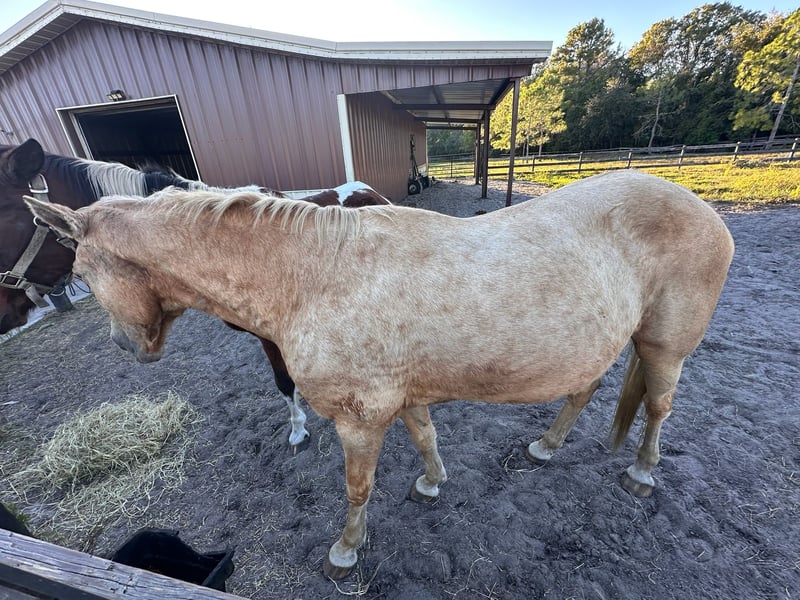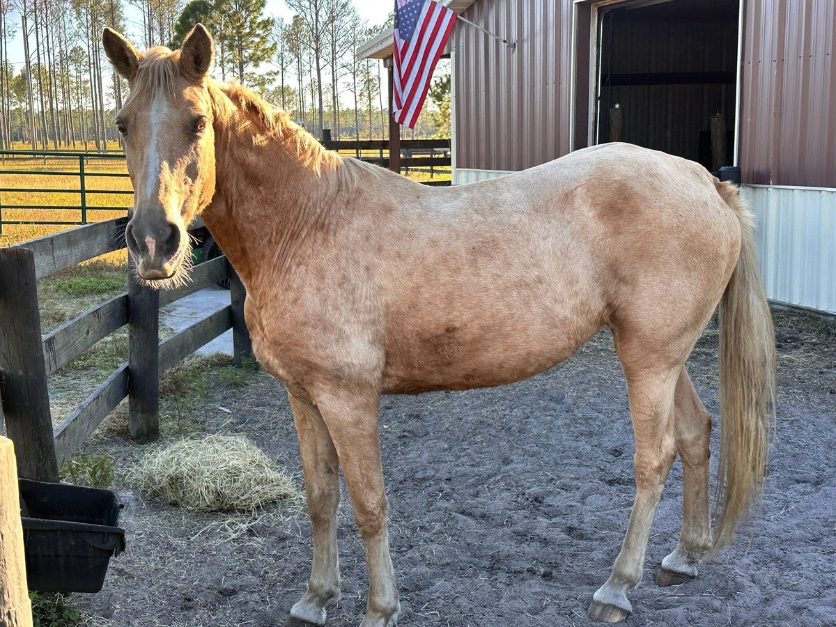 If you are looking for a flashy, smooth-moving partner with the "old soul" temperament of a Heritage-bred walker, meet Dixie. She is a stunning 15-16 year old Palomino mare who turns heads with her golden coat and refined, pretty head. 🐴 The Ride & Gait Dixie is the definition of a natural gaited horse. She boasts a true, four-beat walk with a rhythmic natural head nod and a ground-covering running walk. * The Disposition: Dixie is a "easy-going" soul with a friendly, calm personality. * Current Status: Due to owner illness, Dixie has not been under saddle for approximately 1.5 years. Because she is currently "out of work," she is best suited for an experienced rider who can give her a light refresher to bring her back to her full potential. * Keep: Dixie is a hardy, low-maintenance mare. She lives 24/7 on the pasture, not in a barn. She is well-acclimated to the Florida elements and thrives in a natural outdoor environment. ✅ Health & Maintenance Dixie is current on all her professional care and ready to transition to her new home: * Coggins: Negative (Current as of 1 month ago) * Vaccines: Up to date (Done 1 month ago) * Hoof Care: New feet/trimmed (Done 1 month ago) Dixie is a beautiful, heritage-bred mare who just needs a job again. She’s been a wonderful companion on the property, but she deserves a rider who can get her back on the trails. Call or text owner, Mike Darnall or his secondary contact, daughter Brittany.