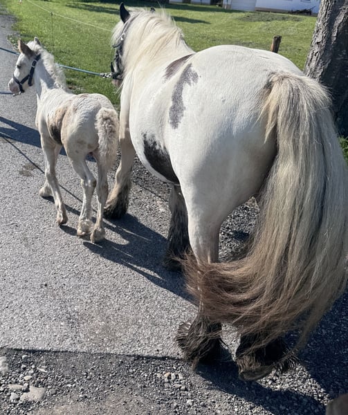 We are selling our beautiful, healthy foal, Charlie. He was born on July 16th, is microchipped, will have a passport at the time of sale, and is regularly dewormed. He is raised in a mixed herd (three mares and one gelding) along with two other foals on a large pasture with an open stable. Charlie is also affectionately called "Prinz Charming" because his warm and friendly nature easily wins everyone over. He has correct conformation, will likely have at least one blue eye, and impresses with his very open, fearless temperament. He is very approachable and friendly with everyone. He will happily join in any fun and, with a height of approximately 136 cm, makes a perfect children's pony as a leisure partner. We are looking for a good home with an open stable management, perhaps initially on a pony pasture, or he can stay for raising, but then he should be gelded around 12 months of age. His mother is a rather athletic and slender Tinker mare (approx. 1.36 m) with plenty of feathering—like his father, a handsome Tinker! The little prince can be sold from December, but as mentioned, it’s also possible for him to stay for raising or to remain with us for a while, allowing Charlie, us, and his new home to get to know each other! You are welcome to spend time with him (preferably multiple times), and if everything fits, anything is possible! What Charlie offers his future owner, among other things, is that he will already know many things by the time he leaves, and he will continue to participate as a lead horse on rides, confidently familiar with road traffic (videos available), everyday noises, and being groomed and led by children—all of which he enjoys! He loves being groomed, easily allows hoof handling, and is introduced to hoof care. I place great importance on regular deworming, especially in the early years. It is very important to me that foals can trust humans and do not have to experience negative encounters, which helps them stay open-minded and gives them the best start I wish for them. For more pictures and videos, please feel free to contact me!