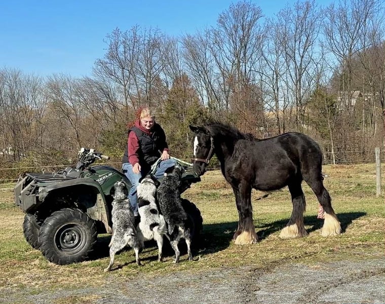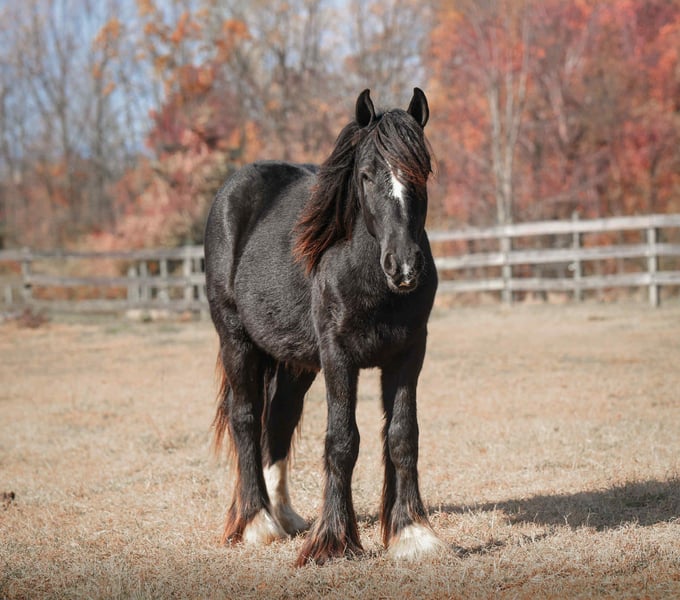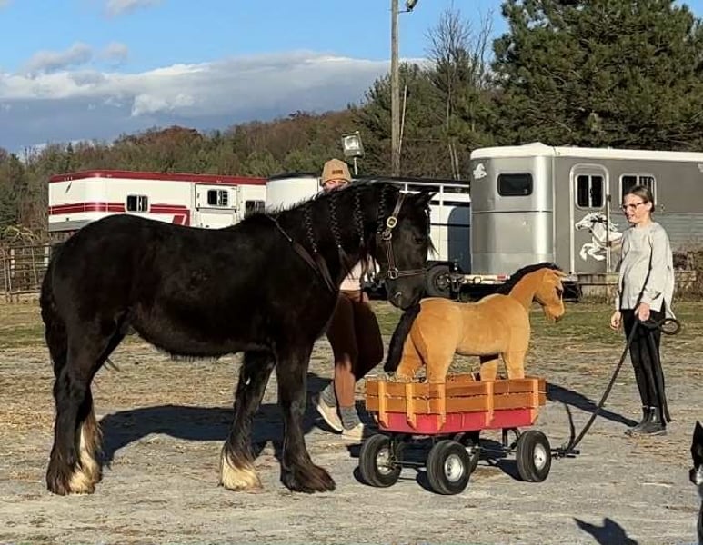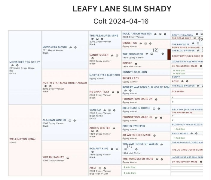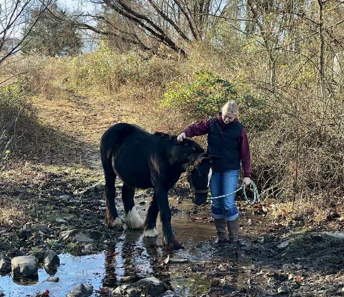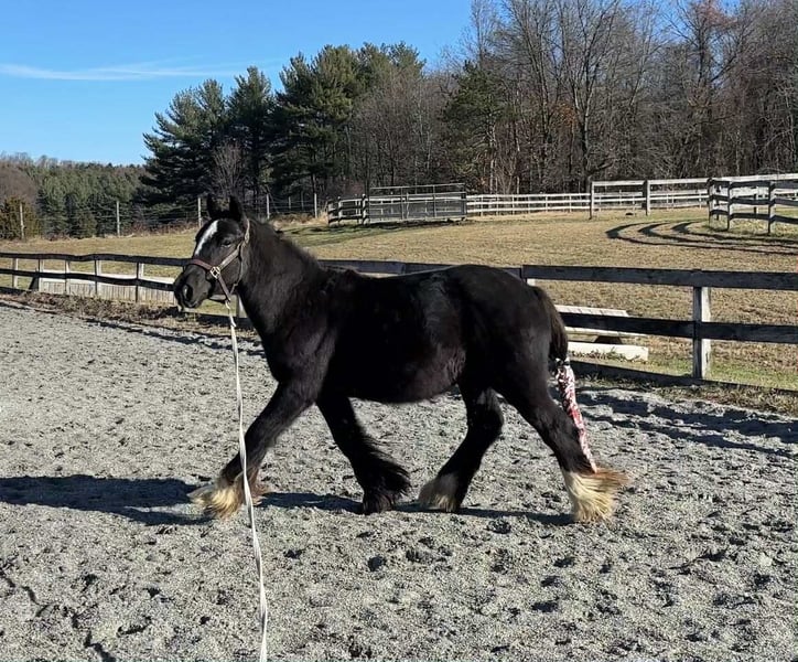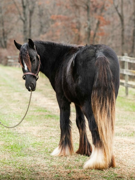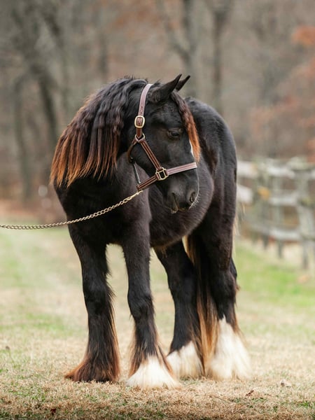 "AVAILABLE ON ONLINE HORSE AUCTION AT www DOT MagicHorseAuction DOT com BIDDING OPEN NOW thru TUESDAY | December 9TH! - BUY IT NOW AVAILABLE! *Final price will be determined on auction site* CONSIGNOR CONTACT INFO: Roni Renee Turner 610-806-2613 LOCATION: New Holland, PA “Leafy Lane Slim Shady” aka “Shady”, is a registered Gypsy Vanner colt, foaled on April 16th 2024, currently standing 13hh, who already owns a lush mane, tail, and feathers. If you are looking for a phenomenal brain, wonderful conformation, great breeding, and the looks to pair, here is your guy. Not only is Shady as friendly as they come, he has a very calm demeanor and an old soul. This boy was quite literally “born broke”. I really cannot say enough of good things about Shady, he is going to make the perfect partner for someone who is looking for a loyal and gentle friend. In the barn, Shady has zero bad habits. He can live in or out, goes out with others happily and has zero bad stall habits. He is quiet in his stall, neat, and never complains or asks for anything. He can live out 24/7, he does not mind either way. Shady will always be the first one to greet you, he will follow you around like a puppy dog and loves attention. He cross ties and straight ties. Shady will stand on the cross ties all day long to be groomed, braided, loved on, you name it. He stands to be bathed as well. Shady is safe for absolutely anyone to work around. He is very gentle and safe for kids and beginners to work with. He doesn’t mind my rowdy dogs running all around his feet. He picks up his feet and is good for the farrier and vet. A crazy busy barn is not frightening to Shady, it is amusing and he will just sit there and chill and watch all of the commotion. Shady has excellent ground manners. He can be fully handled, led, caught, etc by beginners and children. He has had extensive ground work, and he was raised correctly. Shady has gone on hand walks through the woods, through trail obstacles, through water and fields, he is going to be an amazing trail partner in the future. The brain that this young man has, is just not comparable. Shady lunges, and listens to voice commands. He has been tacked several times and never once had a reaction. We have started him on ground driving as well; and again he caught right on and did what was asked. I don’t know if I have ever been around such a teachable yearling!! Shady has been through lots of desensitizing. He takes everything in stride and is pretty much unfazed by all of our crazy antics. He will walk over a tarp, even with it blowing right at him and getting caught on his legs. He doesn’t mind if the tarp is flapping 15’ in the air. He will play with a big ball, and doesn’t mind it being on or around him. We have waved a large flag all around him, he didn’t mind. He follows the wagon with a little “pony” in it, and was much more interested in eating the hay inside of the wagon lol. Atvs and other machinery? Traffic? No problem, he chases the Ranger in the pasture to catch us for hay. Lead him from the four wheeler. Dogs running all over? He doesn’t care. Cows? Cows are friends. Shady has also been introduced to trail obstacles such as walking through pool noodles, over ground poles, over flower boxes and even jumped a few cross rails in hand. He loads and trailers well, with or without company. Shady is going to be easiest guy to start, the hard part is done, here is a horse that is ready to start your way, and be your forever partner. Shady is sired by a stallion named “Monashee Toy Story”, a strapping sire who is beautiful marked. Also known as “Buzz” is considered a mini-Gypsy. He attended the 2023 Gypsy Vanner Congress and is known for his good demeanor and athleticism. Shady’s dam is named “Wellington Kenai”, who is a spitting image of Shady, with great conformation, big bone, and wonderful hair. She is a regular sized Gypsy. Shady is expected to finish at around 14.1-14.2hh. On his Sire’s side, the name “North Star Maestro” will be found, who is a significant representative of the GVH breed, possessing some of the best GV bloodlines. Shady’s top side also goes back to the famous “Bob The Blagdon”. On Shady’s bottom side, he goes back to “Romany King” and influential stallion known for his conformation, amazing temperament, and wonderful movement. Romany King earned a five star evaluation by the GVHS. Slim Shady has excellent breeding, in which has created an amazing all around yearling. Whether you are looking for an all around gelding or a herd sire, these bloodlines speak for themselves. Shady is PSSM1 n/n, FIS n/n, and a/a, E/e, N/W20. Here is a colt that is currently set up to head in absolutely any direction. He has been so wonderful to work with, teach, and have around. Shady is very intelligent, and loves to learn. I would love to have the opportunity to follow this boy and watch him grow and learn, I am very fond of him, the whole barn is. And while I would love to find him his forever person, I am not pressed to sell him, as I just know that he is going to be amazing and very easy to bring along. Please take the time to watch Shady’s full video to get a feel for the type of wonderful guy that he is. Please feel free to reach out for any further information. Shipping can be arranged anywhere.