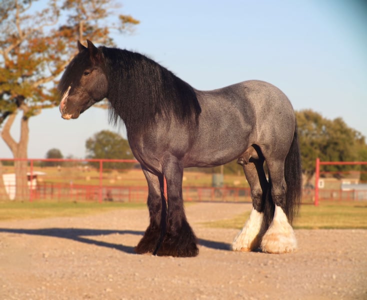 ⚜️ 𝓗𝓮𝓻𝓲𝓽𝓪𝓰𝓮 𝐖𝐢𝐧𝐭𝐞𝐫 𝓒𝓵𝓪𝓼𝓼𝓲𝓬⚜️ Happening now thru MONDAY | DECEMBER 29th - Available EXCLUSIVELY on HorseBid's website! For more details and to register visit: www.Horsebid.com CONSIGNOR CONTACT: BLC RANCH 972-249-5425 LOCATION: Grand Saline, TX BREED: Gypsy REGISTERED: Yes REGISTERED NAME: Topaz COLOR: Blue roan HEIGHT: 14.3 AGE: 6 GENDER: Stallion Meet Topaz Topaz is an exceptional Stallion that impresses and turns heads everywhere he goes. Registered GVHS (Gypsy Vanner Horse Society) AND IGEA (International Gypsy Equine Asso) Standing … with his beautiful blue roan color and matching white socks you won’t find another like him. His demeanor and personality makes him a favorite for everyone. Topaz has been there and done it all. Not only is he trained to lay down and sit on command like a dog he has had extensive saddle and driving training making him as versatile as they come. I guarantee you, you will not ride a smoother gypsy. His gate is impeccable making his ride as smooth as a rocking chair with his one foot cue right into a lope ending with a whoa stop. Topaz knows both of his leads , responds to leg cues , pivots both directions like a quarter horse and has a great stop. When we say he has been there and done it all we mean it. From carrying an extremely large flag in parades , to placing in obstacle course challenges against top quarter horses , to driving to town , going through water, carrying our children and more he has done it all and with ease. While he may not be for everyone. He has been hauled , stalled next to and ridden with mares and is always on his best behavior. The possibilities with Topaz are endless. Make him your number one ride and Breeder Stallion. Just like his name Northern Lights Topaz Gemstone he truly is a gem that will be a great addition for anyone. Sound and Sane - Negative for PSSM1/FIS Current on farrier , deworming , coggins and will come with health cert.