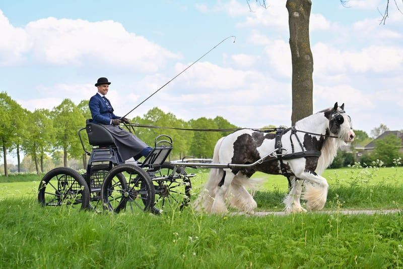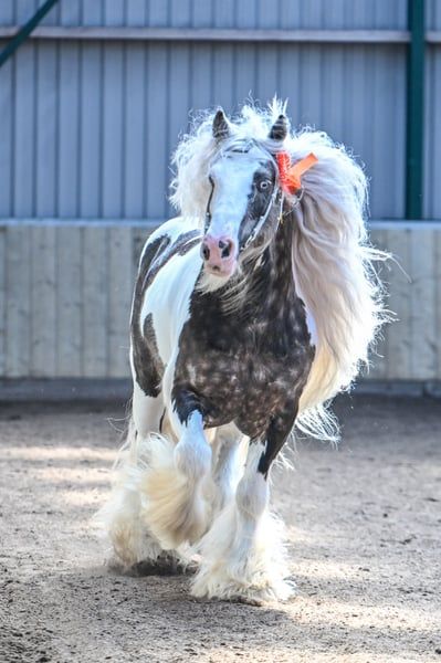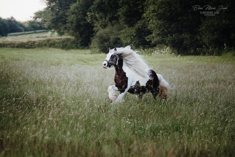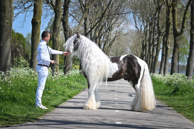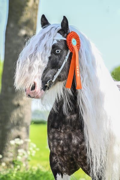 Bentley, ein außergewöhnlicher Name für einen ebenso außergewöhnlich braven Hengst. In der Traumfarbe Black Silverdapple tobiano, zeigt er im Sommer seine wunderschöne Äpfelung wo die Farbe richtig zum Ausdruck kommt. Ein kopfklarer, absolut unerschrockener Hengst mit extrem dicken, vollen Behang und einer traumhaft langen Mähne. Seinen braven neverstarken Character und üppigen Behang vererbt er an seine Fohlen weiter. 2 x vorgestellt und jeweils ausgezeichnet mit einer 1. Prämie und der Auszeichnung STER Hengst, wurde er 2022 in Holland auf der ICS geköhrt und belegte bei einer starken Internationalen Konkurrenz den 4. Platz. Er hat seine Fahrprüfung mit einer hohen Punktzahl und einer 1. Prämie und 1. Platz belegt. Bentley deckt brav an der Hand, auch bei deutlich kleineren und größeren Stuten (1,65 m). Er ist brav im Umgang und weiss sich zu benehmen, auch wenn er neben Stuten im Stall steht. Alle seine Fohlen die auf einer Körung vorgestellt wurden, erhielten eine 1. Prämie. Er steht Tinkerstuten, Fremdrassen und Mix Stuten zur Verfügung. *pssm frei *black silverdapple tobiano