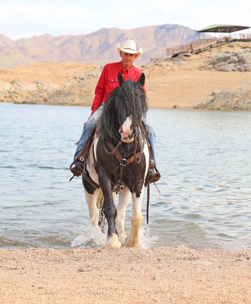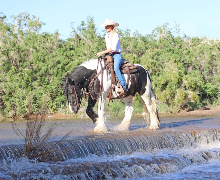 ⚜️𝐓𝐇𝐄 𝐅𝐀𝐋𝐋 𝐇𝐄𝐑𝐈𝐓𝐀𝐆𝐄 𝐂𝐋𝐀𝐒𝐒𝐈𝐂⚜️ Happening now thru MONDAY | NOVEMBER 3rd - Available EXCLUSIVELY on HorseBid's website! For more details and to register visit: www.Horsebid.com CONSIGNOR CONTACT: Sarah & Mozaun McKibben 903-815-5150 LOCATION: Cave Creek, AZ BREED: Gypsy Vanner REGISTERED: No COLOR: Black & White HEIGHT: 15 AGE: 10 GENDER: Gelding Meet Pudge — the trustworthy trailblazer you’ve been waiting for. This beautiful Gypsy Vanner gelding has been down the miles on the trail and out working the ranch. Affectionately known as Pudge, he’s got hair for days — a forelock that falls past his nose, and a mane and tail thick enough to make any fairytale horse jealous. Pudge is as kind-hearted as he is eye-catching. He truly loves his people, always the first to meet you at the gate and the last to leave your side — a true puppy-dog type. Gentle, mannerly, and calm whether you’re on the ground or in the saddle, he’s the kind you can trust every single ride. Ride him western, English, or bareback — he’s as comfortable as your living room couch and always a pleasure to ride. Pudge is steady, no-nonsense, and endlessly reliable. He’s spent time on a large working ranch checking fences, gathering cattle, and ponying colts. Surefooted in the rocky Arizona mountains, he’ll cross water, go through brush, and never blink at wildlife — elk, deer, coyotes, or birds. He’s just as confident solo as he is in a group. Around town, Pudge turns heads and takes everything in stride — traffic, motorcycles, strollers, and crowds don’t bother him one bit. He’s always happy to soak up a little extra attention from admirers. Under saddle, he’s smooth and easy with a ground-covering walk, a nice extended trot, and will lope on a loose rein. He knows his leads, transitions well, and stands like a statue for mounting. He’ll ground tie wherever you drop a rein and is a gentleman for clipping, bathing, and grooming. Leave him off for months, and he’ll be the same steady partner when you saddle him up again. Pudge requires no special maintenance, lives happily outdoors year-round at our Arizona ranch, and is always ready to go wherever you point him. Whether you’re looking for a dependable ranch horse, a safe and comfortable trail partner, or simply a best friend to share the miles with — Pudge is your guy.