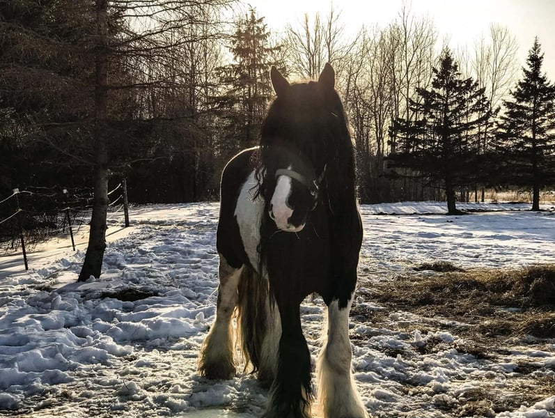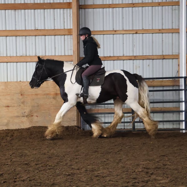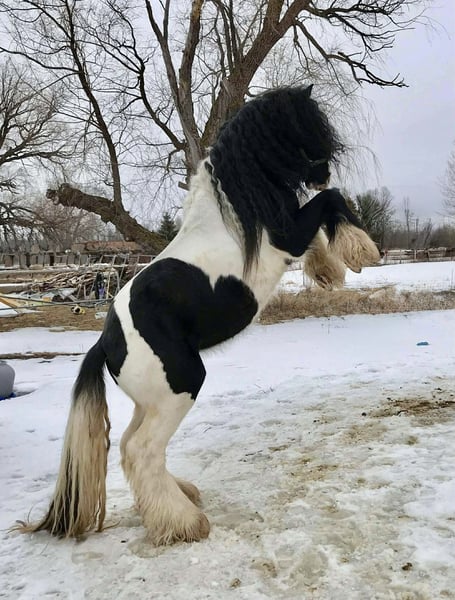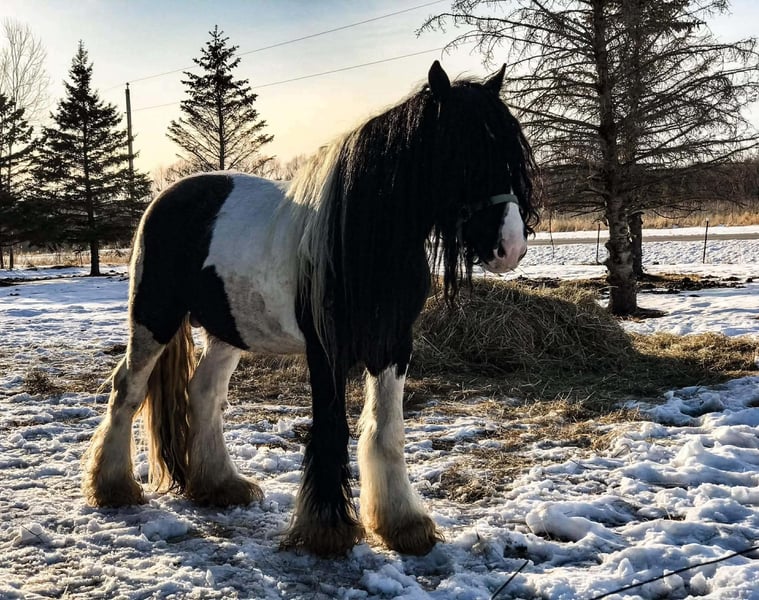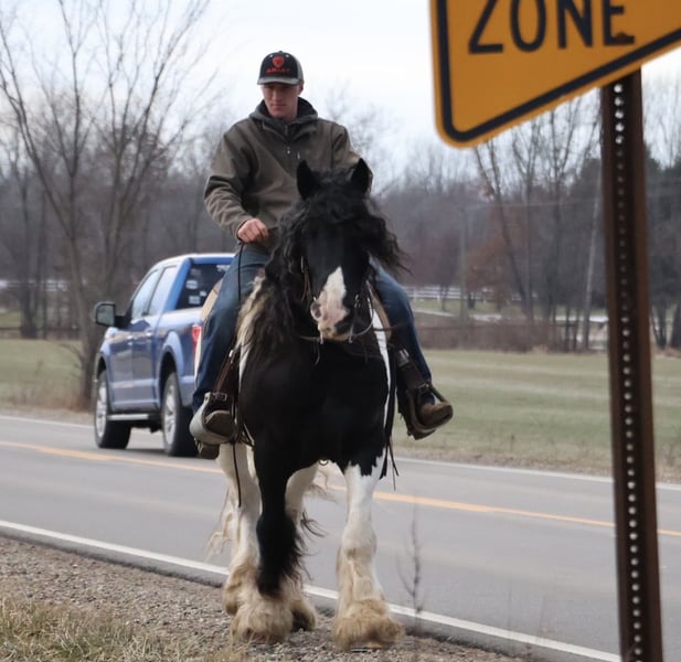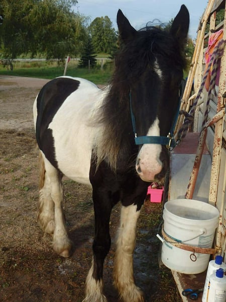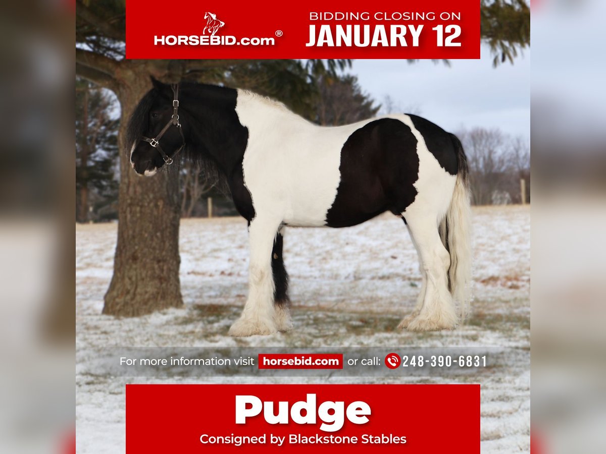 ♦️𝐍𝐄𝐖 𝐘𝐄𝐀𝐑'𝐒 𝑬𝒙𝒕𝒓𝒂𝒗𝒂𝒈𝒂𝒏𝒛𝒂♦️ Happening now thru MONDAY | JANUARY 12th - Available EXCLUSIVELY on HorseBid's website! For more details and to register visit: www.Horsebid.com CONSIGNOR CONTACT: Blackstone Stables 248-390-6831 LOCATION: Howell, MI BREED: Gypsy Vanner REGISTERED: No REGISTERED NAME: Pudge COLOR: Black and White Paint HEIGHT: 15.1 AGE: 10 GENDER: Gelding He's checking in at a solid made 15.1hh. He's a stunning black and white 12 year old gypsy vanner gelding. We are happy to introduce "Titanium's Pride" or pudge as we call him at home. His round figure and puppy dog demeanor are how he's earned his name. He has seen many miles on the trails from AZ to OR to MI and has proven himself to be a trustworthy trailblazer. Pudge has he’s got hair for days - a forelock that falls past his nose, a thick and naturally wavey mane that falls past his shoulders, a perfect tail that hits the ground and perfect feathering on all 4 legs. He looks like a picture in a magazine. His looks and conformation are no suprise as he has Tieg, The Lion King and The lion Queen on his papers. We are selling him as grade as he came with just a photo copy of his bloodlines. We have included a few baby photos of him 🙂. We are working on obtaining the original paperwork. Pudge is as kind-hearted as he is eye-catching. He truly loves his people, always the first to meet you at the gate and the last to leave your side — a true puppy-dog type. Gentle, mannerly, and calm whether you’re on the ground or in the saddle, he’s the kind you can trust every single ride. Ride him western, English, or bareback — he’s as comfortable as your living room couch and always a pleasure to ride. Pudge is steady, no-nonsense, and endlessly reliable. He’s spent time on a large working ranch checking fences, gathering cattle, and ponying colts. He has seen the rocky Arizona mountains, the deep woods of Michigan and the trails of Oregon. He will cross water, bridges, brush and ride down main roads. He is not one to notice wildlife, from elk, deer, coyotes, and birds he will remain as steady as they come. Pudge will ride out alone with plenty of confidence but will also join others in a group. Pudge has been in parades, carried the flag and has been to town. He is noticed wherever you take him and will gladly accept attention from anyone who wants to say hi. In the arena he is smooth and steady. He has 3 solid gaits, effortless transitions while being more whoa than go. He will steep right into the canter and take both leads. He also has beautiful flying changes! Pudge will stand anywhere you ask him for mounting dismounting or just in general. He is great for clipping, bathing, grooming and tacking. He's the type that can sit I the pasture and go to work once a month or every day with out issues. Pudge has been jumping around and he is fantastic at it! He's very brave to the jumps. He loads and hauls like a pro! He can live in or out and will play well with his equine buddies!Whether you’re looking for a dependable ranch horse, a safe and comfortable trail partner, a hunter type or simply a best friend Pudge is your guy.