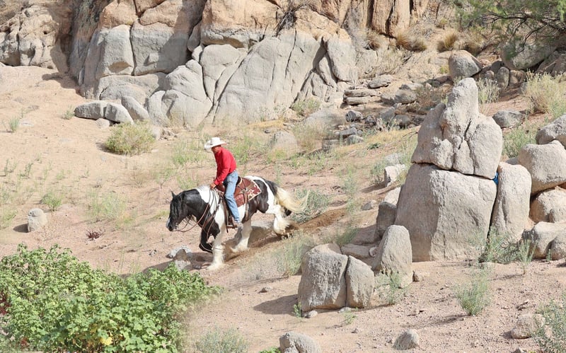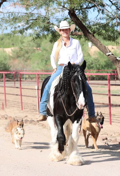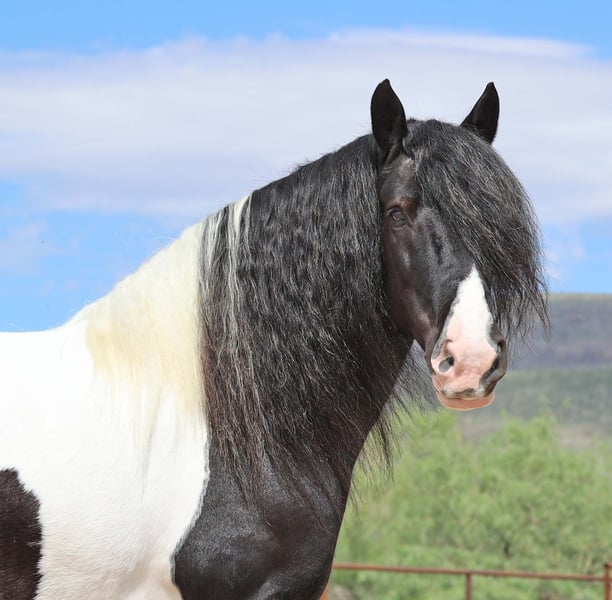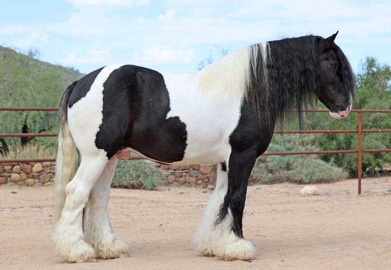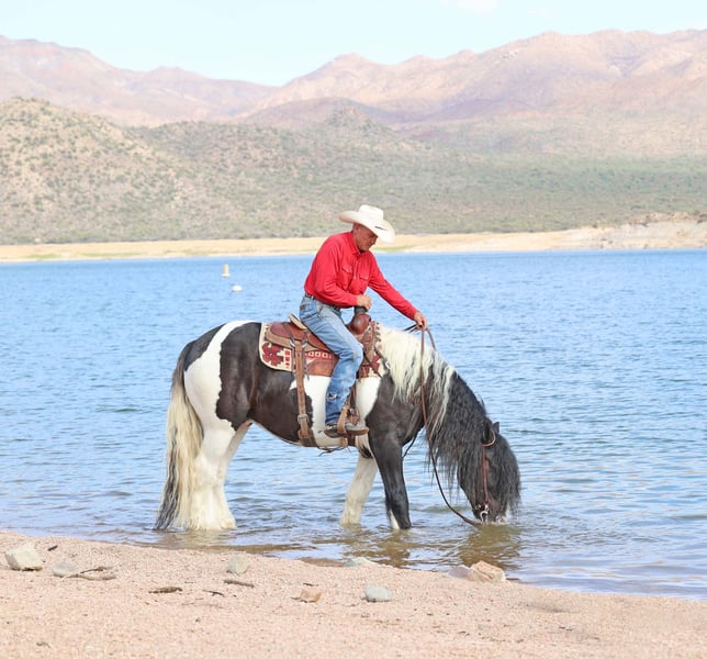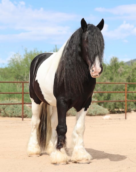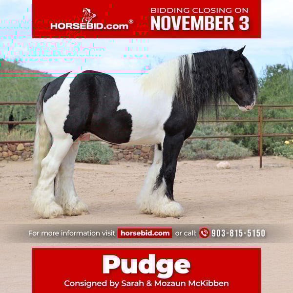 ⚜️𝐓𝐇𝐄 𝐅𝐀𝐋𝐋 𝐇𝐄𝐑𝐈𝐓𝐀𝐆𝐄 𝐂𝐋𝐀𝐒𝐒𝐈𝐂⚜️ Happening now thru MONDAY | NOVEMBER 3rd - Available EXCLUSIVELY on HorseBid's website! For more details and to register visit: www.Horsebid.com CONSIGNOR CONTACT: Sarah & Mozaun McKibben 903-815-5150 LOCATION: Cave Creek, AZ BREED: Gypsy Vanner REGISTERED: No COLOR: Black & White HEIGHT: 15 AGE: 10 GENDER: Gelding Meet Pudge — the trustworthy trailblazer you’ve been waiting for. This beautiful Gypsy Vanner gelding has been down the miles on the trail and out working the ranch. Affectionately known as Pudge, he’s got hair for days — a forelock that falls past his nose, and a mane and tail thick enough to make any fairytale horse jealous. Pudge is as kind-hearted as he is eye-catching. He truly loves his people, always the first to meet you at the gate and the last to leave your side — a true puppy-dog type. Gentle, mannerly, and calm whether you’re on the ground or in the saddle, he’s the kind you can trust every single ride. Ride him western, English, or bareback — he’s as comfortable as your living room couch and always a pleasure to ride. Pudge is steady, no-nonsense, and endlessly reliable. He’s spent time on a large working ranch checking fences, gathering cattle, and ponying colts. Surefooted in the rocky Arizona mountains, he’ll cross water, go through brush, and never blink at wildlife — elk, deer, coyotes, or birds. He’s just as confident solo as he is in a group. Around town, Pudge turns heads and takes everything in stride — traffic, motorcycles, strollers, and crowds don’t bother him one bit. He’s always happy to soak up a little extra attention from admirers. Under saddle, he’s smooth and easy with a ground-covering walk, a nice extended trot, and will lope on a loose rein. He knows his leads, transitions well, and stands like a statue for mounting. He’ll ground tie wherever you drop a rein and is a gentleman for clipping, bathing, and grooming. Leave him off for months, and he’ll be the same steady partner when you saddle him up again. Pudge requires no special maintenance, lives happily outdoors year-round at our Arizona ranch, and is always ready to go wherever you point him. Whether you’re looking for a dependable ranch horse, a safe and comfortable trail partner, or simply a best friend to share the miles with — Pudge is your guy.