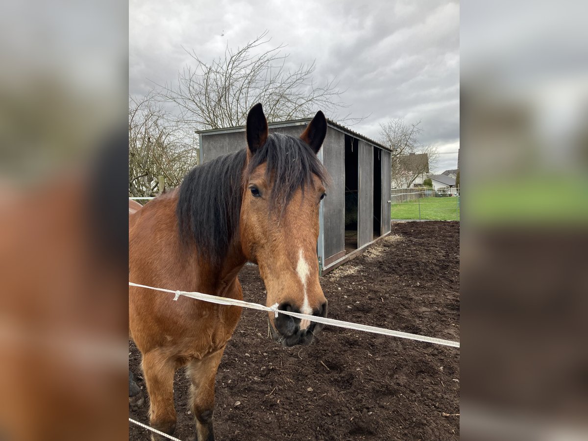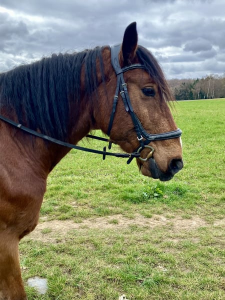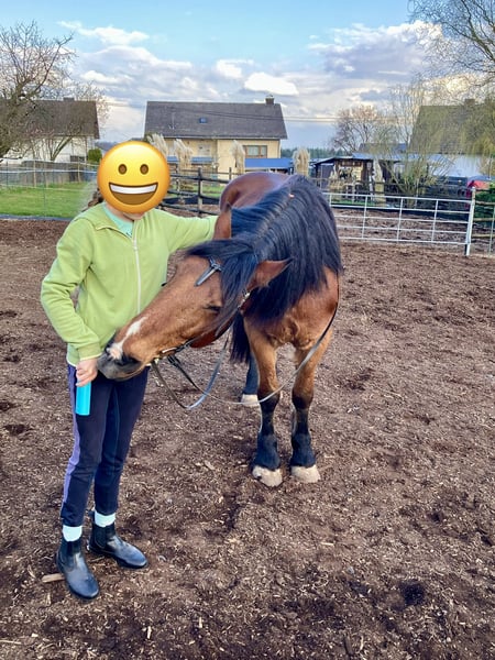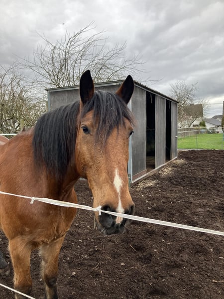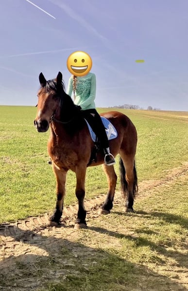 Schweren Herzens suchen wir für unseren hübschen Tinker-Mix Wallach Jack ein neues, passendes Zuhause. Er ist 13 Jahre alt und ca. 163 cm groß. Aufgrund seiner Statur deckt er auch große Reiter gut ab (Reiter auf dem zweiten Bild ist 1,92m groß). Jack ist ein menschenbezogenes Pferd, das Aufmerksamkeit und Zuwendung sehr genießt – oft wiehert er sogar zur Begrüßung, wenn man zum Stall kommt. Unter dem Sattel ist er in der Halle und auf dem Reitplatz brav und eher gemütlich zu reiten. Er kann dort auch von unsicheren oder schwächeren Reitern gut gehandhabt werden. Von äußeren Einflüssen (Traktoren, Hunde…) lässt er sich nicht beeindrucken. Im Gelände zeigt Jack sich motivierter und testet gelegentlich, ob er schneller gehen darf. Dabei kann auch einmal ein freudiger Bocksprung vorkommen, den man sitzen können sollte. Daher wünschen wir uns für ihn im Gelände einen sicheren und erfahrenen Reiter. Ruhige Ausritte im Schritt sind problemlos möglich – auch alleine. Er steht aktuell barhuf, braucht noch weiteres Training beim Hufegeben, ist verladefromm, frisch geimpft und entwurmt, Zähne kontrolliert. Er wird freizeitmäßig geritten und hat auch im Winter schon einen Kinderschlitten gezogen. In der Herde ist er rangmäßig im Mittelfeld. Er kennt sowohl Boxen- als auch Offenstallhaltung. Wir haben Jack für unsere 12jährige Tochter zum Ausreiten gekauft, weil er uns als total verlässlich beschrieben wurde. Leider zeigt er sich bei Ausritten nicht immer so händelbar, wie wir es uns für unsere Tochter, die eher eine ängstliche Reiterin ist, wünschen. Da wir keine Halle und keinen Reitplatz haben, passt es leider nicht. Wir wünschen uns für ihn ein liebevolles Zuhause bei Menschen, die seine freundliche Art zu schätzen wissen und ihm eine klare, ruhige Führung geben können und Spaß daran haben, weiter mit ihm zu arbeiten. Weitere Informationen gerne per PN.