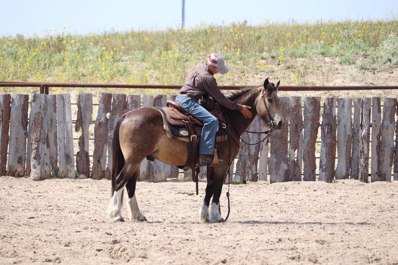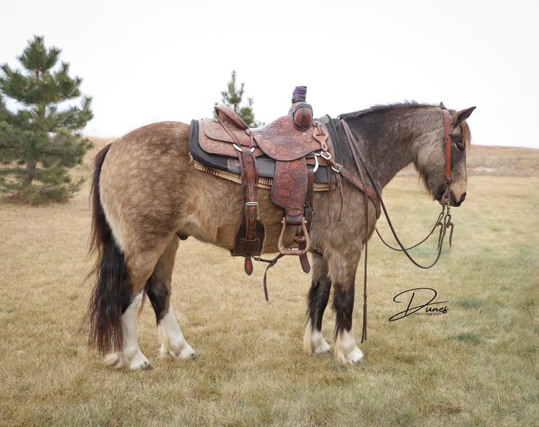 🎄𝐓𝐇𝐄 𝑯𝒐𝒍𝒊𝒅𝒂𝒚 𝐂𝐋𝐀𝐒𝐒𝐈𝐂🎄 Happening now thru MONDAY | DECEMBER 15th - Available EXCLUSIVELY on HorseBid's website! For more details and to register visit: www.Horsebid.com CONSIGNOR CONTACT: Dunes Horsemanship LLC 308-262-5020 LOCATION: Thedford, NE BREED: Gypsy Cross REGISTERED: No COLOR: Buckskin HEIGHT: 13.2 AGE: 3 GENDER: Gelding Wheezy is a three year old Gypsy cross with just enough feather and foot to make him look fancy, without all the upkeep that comes with the full blood gypsies! He stands 13.2 and his feet are big enough to make some quarter horses blush! He is currently giving his best impression of a wooly mammoth, but he sheds out into a dark buckskin in the spring and hangs onto those big pretty dapples! Nowhere in my plans did I have offering Wheezy written down, and believe me when I say, it breaks my heart to let him leave, but he is simply too good to keep hidden away here in these hills when he will bring so much joy to a family needing something safe, sound, and reliable. Wheezy walks out like a big horse and has drug a handful of calves at brandings this spring, gathered pastures as the sun came up, and meandered through town this summer. He knows his leads, is starting to get his flying lead change figured out, has a fancy little spin, and is nice and soft in either a bridle or just a halter. He will cross water, loads and unloads with ease, and would halter himself if he had thumbs. He is an absolute pet and loves to be in your pocket any chance he gets. Though he is young, he is an old soul and has never once left me feeling unsafe. Brush the snow off his back and crawl on. He will get you to and from safe and sound! I truly feel he would be suitable for anyone ready to step up from that old faithful to a young and eager yet SAFE gelding. Wheezy is still perfecting his neck rein, but he is the PERFECT project for your little one who is ready to finish their own horse their way, without the risk of starting a colt from scratch. He has a fantastic foundation and is ready for his next family. He has packed kids around some in the arena and is ready to find his forever family with hopefully a handful of kids to teach to love horses! Wheezy has been an absolute joy to have and anyone who is lucky enough to bring him home, will be certain to never find another like him! As with any of our horses, please bring him back at any time for a refresher should you ever feel the need, or just to brush off the cobwebs after a long winter. We want nothing more than for Wheezy to be loved and enjoyed by his new family and we we will go above and beyond to make sure he find his forever! Please reach out with any questions you may have or to come take him for a spin! Tess Chytka Dunes Horsemanship LLC 308-262-5020