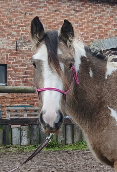 Here comes your dream horse! An Irish Cob gelding in an absolutely stunning color – Buckskin Tobiano – with a long, flowing mane! Pepe is a true charmer. He loves to be cuddled and pampered. He patiently allows hours of brushing his mane and coat. He calmly gives his hooves and is very easy to handle from the ground. Pepe has already been lunged with a saddle and is familiar with rider weight. He is very well-behaved in this regard. He is kept in a robust turnout in a mixed herd and is barefoot. Born May 2022 Approx. 14.5 hh Paperwork from ICS NL