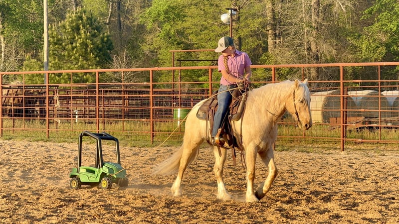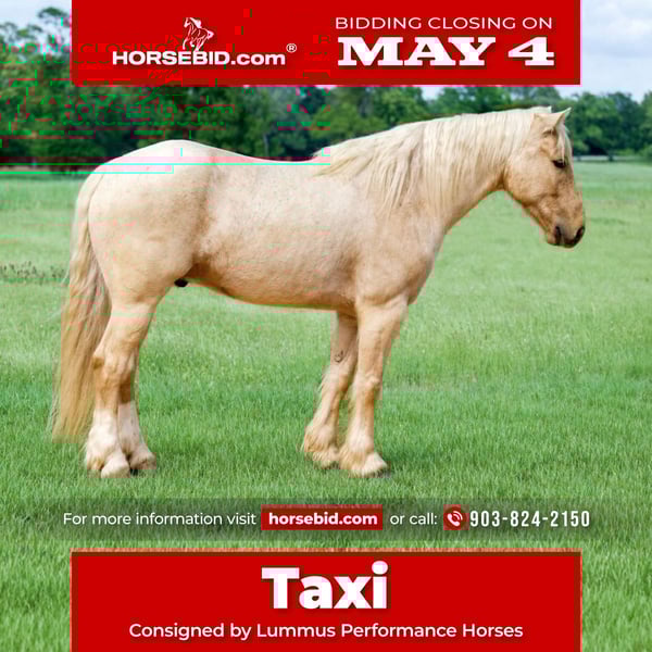 ▪️▫️◾️𝐭𝐡𝐞 𝑴𝒂𝒚 𝐒𝐞𝐥𝐞𝐜𝐭◾️▫️▪️ Happening now thru MONDAY | MAY 4th - Available EXCLUSIVELY on HorseBid's website! For more details and to register visit: www.Horsebid.com CONSIGNOR CONTACT: Lummus Performance Horses 903-824-2150 LOCATION: Bloomburg, TX BREED: Gypsy Vanner Cross REGISTERED: No COLOR: Palomino Roan HEIGHT: 14.1 AGE: 4 GENDER: Gelding Taxi is a 4 yr old palomino roan half Gypsy Vanner X Quarter Horse. He stands 14.1 hands tall and as wide as he is tall! Taxi has all the bone and foot you could ask for! He is one of those horses that can be used inside the arena or out and is the perfect size to do any discipline for an adult or an intermediate kid. Taxi was raised and trained by a friend of ours where he was started correctly. He has all the fancy buttons, wants to have a sliding stop, he has correct turn arounds, and you can move hips and shoulder. He has mostly been rode by my 10 yr old daughter since we have owned him. He has been hauled extensively to town, team ropings, and rodeos. So ropes swinging and loud speaker systems don’t bother him a bit! Taxi is a pleasure to ride and has all the outside experience as well, trail riding thru brush and thickets, crossing creeks, dragging logs, riding down the road with traffic, hog hunting, and working cows. I would say he needs an intermediate rider though outside in the woods just because he will sometimes jump the creeks. But as far as riding gentle inside the arena and outside of the arena he is great. He will lead or follow in the pack on a loose rein. Taxi is fun to ride and has very smooth and flowing gaits. He will Walk/Trot/Lope good circles, catches both leads, and stays between your feet and hands. He will even side pass and open/close gates. He is VERY athletic and could make a top performance horse! Taxi gets along with everything in the pasture. He is in the middle of the pecking order. He doesn’t let anyone pick on him but also won’t pick at anyone else. He leads, loads, stands tied quietly, bathes, grooms, and stands to be saddled/bridled. He has excellent ground manners and a fun-loving personality that just goes with the flow and takes everything in stride. He can be stalled or turned out on grass. Taxi is traffic safe and machinery safe. He’s good with dogs, kids, and even Segways moving around him. He is gentle and loves people, he wants to be with you every second of the day! Easy to catch in a pasture, stalls good, and drinks/eats on the road. Taxi has been my 10 yr olds go to for everything! She has been starting him on the barrels, poles, goat tying, and breakaway! He is the same horse every time you step him out of the pasture, he has ZERO buck, even with time off. He is young enough to last and seasoned enough to enjoy! Taxi is easy to keep, we don’t have any special regimen for him. He is UTD on farrier, dewormer, and vaccinations. He is 100% sound and stays barefoot.