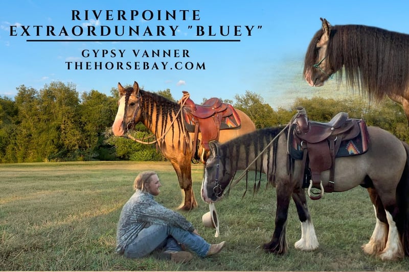 OPEN BIDDING ON THEHORSEBAY,COM. SALE ENDS ON 08/26 @ 4PM CT. More information is available on the website, including an UTD vet inspection, Coggins, video, images, and the owner's contact information to ask questions, request information, or make arrangements to come to visit. A more special 3 year old cannot be found. This gentle, quiet, smart Gypsy Vanner gelding “Bluey” has potential to be an all around gelding for your family or lesson programs. He has a solid gentle start of 120 days and is the most willing horse I have ever spent time with. Gentle and quiet to groom, meets you at the gate for attention and loads and travels like an expert show horse. Bluey has proven to have a quiet demeanor typical of the Gypsy breed and is eager to keep adding to his resume. Bluey has been willing to move through obstacle courses without hesitation or spook. His arena work has included walk-trot-halt transitions and the occasional short lope. Bluey has excellent manners on the ground and in the saddle and has proven himself to be a dependable mount. Bluey’s grulla coat is stunning! Much like an Akhal Teke’s metallic sheen changes depending on sunlight, Bluey’s coat hues range from a dark and deep honey to a cool and smoky silver depending on season and sunlight. Bluey, despite his young age, has already demonstrated he is on a path to be your ‘tried and true’ mount. Even at such a young age at 3 years old, he carries complete beginners with grace and care – forgiving unintended hand and leg cues – as well as experienced riders who ask more as they finetune his neck rein, transitions, etc. Bluey loves being groomed and will stand at the wash rack patiently. He can be cross tied or not, your choice, he’s not fussy. His feathers are his great pride, and he gets a blow out with a leaf blower after grooming. He is calm and collected – and even the leaf blower on max doesn’t phase him. He has been around farm equipment, dogs, cats, donkeys, longhorns, chicken, little kiddos – same reaction to all – looks to acknowledge and if it doesn’t involve human pets or a treat, then just keeps on grazing. He is a gem, and I can’t wait to see all the places he will go!