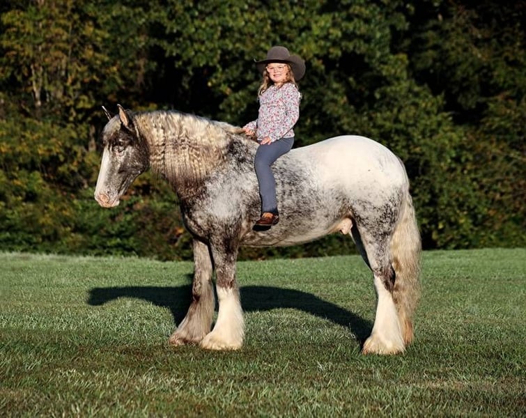 Consigned to Cowgirl Cadillacs in Sheridan, WY. Sales June 14-15th. You can bid online, phone bid or bid in person! Have you been waiting for a knight in shining armor to sweep you away? DANTE STEEL KNIGHT is what you have been waiting for! With a unique roan/appaloosa coat, fluffy feathered legs, poofy mane and tail, loving personality and a heart of gold, even the medieval era did not have a knight like this!!! Over the last year with us Dante has stole the hearts of our little girls! He is Mr. Personality and Mr. Patient! He loves attention and grooming or anything that involves interacting with people! Dante is a well built 15hh, 5 year old, Appaloosa colored, registered Gypsy Vanner gelding! He has a smooth jog, a very nice lope, he reins around and turns a circle both ways, sides passes and backs with ease! Dante knows a trick or two as he lays down for mounting/dismounting. No wonder people love gypsies; their popularity is driven by their versatility and calm nature! Dante is a true ambassador of breed. Dante can go out and ease down the trails. He will cross deep water, rough rocky areas, scale steep slopes and pick his way over deadfall, all while keeping his rider safe! He has been used around the ranch to check cattle, sort pairs and he has roped/doctored calves as well. We have had him down the highways, through town and he is safe around all traffic. He has seen the bright lights and heard the loud speakers as we had Dante in a Christmas play called “Journey Through Bethlehem” which had around 250 actors in it. Dante was ridden as a roman soldier’s horse, for several hours, as he walked up/down rows of car loads of people. Of course folks were taking pictures and reaching out their windows to pet him. Over the 2 nights approximately 8000 cars drove through the “live nativity scene”. We have tested Dante in every way that we know how and he has passed every single test with nothing less than a perfect score! He has shown us that any age and any ability level can enjoy him. If you have been waiting for your knight in shining armor to arrive… HE IS HERE!!! Call 606-308-2461 for more info.