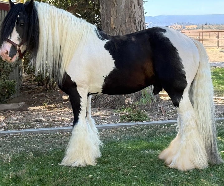 purebred Gypsy Vanner stallion with both beauty and brains. He is sired by Blue Mountain Tiger — a 10-time U.S. National Gypsy Champion — and out of Olde Horse of Wales Last Charm. Carrying on that legacy, Seneca himself is a two-time National Champion. Highlights: Breed: Purebred Gypsy Vanner Color: Black & White Heterozygous Tobiano Height: 16.1 hands Training: Western & English Dressage (trained by Scott and Ashley Sarkozi) Accomplishments: 2 National Titles + numerous class wins Conformation: Straight legs, short back, solid feet, excellent proportions Feathering: Exceptionally heavy mane, tail, and feather Seneca is everything you dream of in a Gypsy stallion: commanding presence, powerful movement, and that signature Gypsy head toss — all wrapped in a gentle, willing, and playful temperament. He’s reliable under saddle, affectionate on the ground, and loves to connect with people. Though a decorated champion, Seneca is not just about titles. He’s a versatile partner ready for his next chapter — whether continuing in the show ring, enjoying dressage and equitation, or simply being someone’s beloved daily riding horse and trail companion.