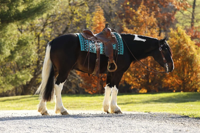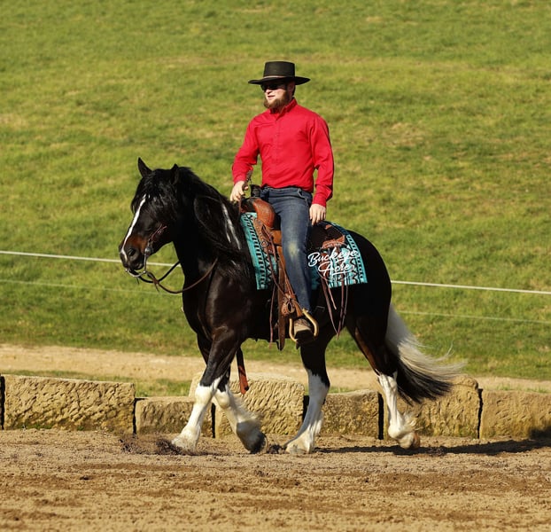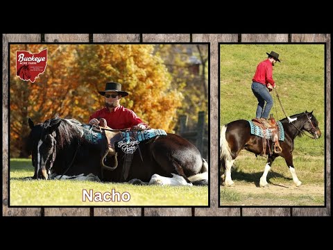 Meet Nacho, a stunning 2018 model Gypsy Cross gelding who stands a strong and sturdy 14.2 hands. With his four crisp white socks and that beautiful dark brown and white paint coloring, he turns heads everywhere he goes. But as impressive as he looks, it is his steady mind and willing heart that truly set him apart. Nacho has been exposed to about everything you can throw at a horse. He has confidently traveled state roads, handled traffic, made his way up and down steep hills, crossed water, stepped over logs, and explored miles of trails, always with a calm, thinking attitude. He takes each new task in stride and genuinely enjoys having a job. He has been used to check cattle and fence lines, showing he’s not just pretty but also handy around the farm. He does great on group trail rides and is just as dependable when you want to head out alone. One of the best things about Nacho is that you do not have to ride him every day to keep him the same. He comes out with the same good mind and willing attitude no matter how often you climb on. Nacho has been ridden in both the indoor and outdoor arenas and goes nicely western, English, or bareback. He even rides bridle less, which shows his softness, responsiveness, and solid foundational training. He loves attention and is wonderful with children. Truly anyone can ride him — from beginners to seniors to advanced riders. He adjusts to his rider and always tries to make things easy. In the barn and the pasture, Nacho is a true gentleman. He is respectful, polite, and easy to be around. He gets along well with other horses but is also perfectly content being by himself. No drama, no fuss, just an honest, good-minded gelding. His movement is another highlight. Nacho offers three quality gaits, and his trot is something special — smooth, balanced, and the kind you can sit all day long. It is truly a “must feel to believe” trot that makes every ride enjoyable. He is confident with tarps, jugs and whips, stays level-headed in new places, side passes to the mounting block, and always tries to do the right thing. Whether you’re looking for a dependable trail partner, a versatile arena horse, or a safe and steady mount for the whole family, Nacho is the kind that gives you confidence, keeps you smiling, and meets you at the gate ready to go to work with his willing attitude every single day. If this sounds like the horse that you have been looking for, please reach out to Duane @ 330-231-2324 for more information.