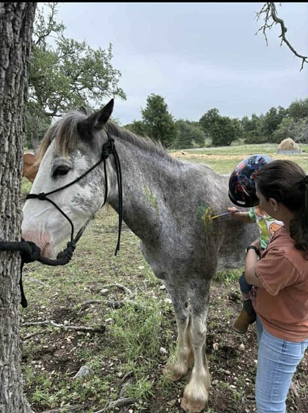 ONLINE AUCTION Place your bids at www.PlatinumEquineAuction.com Starting Bid $3500 Auction ends September 28th, 2025 Need a new saddle? Check out White Rock Saddles on our website or Facebook Looking for a reliable, beautiful, and family-friendly horse? Look no further than Bluebell! This stunning 7-year-old blue roan Gypsy Vanner/Paint cross is the ideal horse for trail riding, family adventures, and creating lasting memories. Standing at a sturdy 14 hands, Bluebell is the perfect size for both kids and adults to enjoy. Bluebell has a heart of gold and a gentle disposition that makes her a joy to be around. She rides English or Western! We been using her for people to learn English on and she’s been a great teacher for kids and adults. Bluebell is patient and forgiving, making her an excellent choice for inexperienced riders. She has been use in kid camps for lessons. Bluebell has also carried around autism kids letting them enjoy a great ride. She is always eager to please and loves attention, whether it’s grooming, trail rides, or just hanging out in the pasture. Bluebell truly shines on the trails or in the arena. Her calm demeanor and sure-footedness make her a reliable partner in any terrain. She handles various trail obstacles with ease. Water crossings, rocky paths, or wooded areas – Bluebell takes it all in stride. She’s safe around traffic, fire, and even trails. I’ve done a little bit of everything on her. Bluebell is more than just a trail horse; she is a member of the family. Her gentle nature makes her safe and fun for the family to ride and handle. She loves being groomed, petted, and spending time with her person. Bluebell is also easy to catch in the pasture and stands quietly for mounting and dismounting. Bluebell is up-to-date on everything. She is one of a kind that we will be sad to see leave if her forever person comes! Come see her for yourself or we can schedule a FaceTime to meet her! Call or text Makayla with MW Horses at (254)434-8650. Need hauling? We got a list of reliable haulers around the US! ONLINE AUCTION Place your bids at www.PlatinumEquineAuction.com Starting Bid $3500 Auction ends September 28th, 2025 Need a new saddle? Check out White Rock Saddles on our website or Facebook