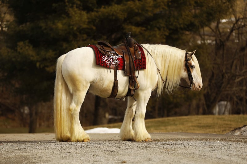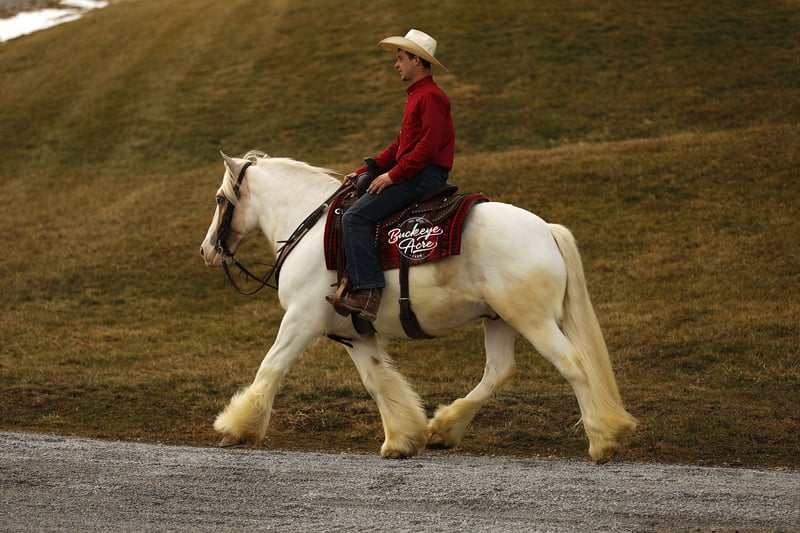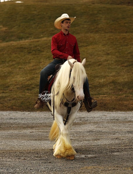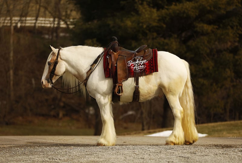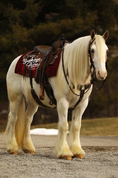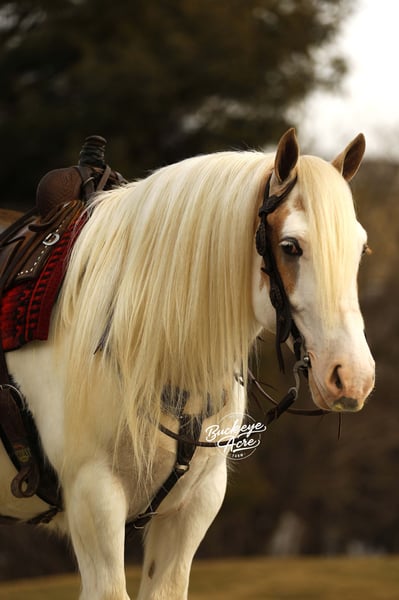 Bingo is a 2018 model standing 14.3 hands and registered with the Gypsy Horse Association. With his rich Palomino Tobiano color and one striking blue eye, he naturally grabs attention wherever he goes — but it is his ability and disposition that truly set him apart. In the arena, he rides Western, English, and bareback with the same steady, willing attitude. He knows his leads, side passes with ease, and carries smooth, comfortable gaits that make him enjoyable for long rides or relaxed schooling sessions. He stays soft, responsive, and aims to please every time you swing a leg over. Bingo also drives in the carriage and does so confidently, showing his versatility and solid foundation. He has been exposed to plenty and handles it all with a level head — traffic on state roads, whips, jugs, tarps, flags — he takes it all in stride. He has even trained to sit down, which never fails to impress and shows just how willing and broke he is. Outside the arena, he has logged many trail miles. He crosses water without hesitation, navigates different terrain with confidence, and is comfortable checking cows. He genuinely enjoys getting out and exploring new places, making him a fun and dependable partner for adventures. His temperament is one of his best qualities. He has a kind, steady mind and a true want-to-please attitude. In the barn, he is respectful and easy to handle. In the pasture, he gets along well with others or is perfectly content turned out alone. Bingo is up to date on his vaccinations, deworming, and shoeing, making him ready to step right into his next home. If you are looking for a flashy gelding with real-world experience, versatility, and a great personality to match his good looks, Bingo offers the complete package — a horse that is just as enjoyable to ride as he is to own. Please feel free to reach out to Duane @ 330-231-2324 for more information.