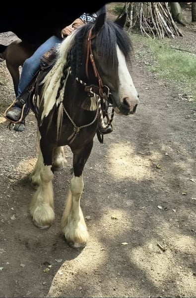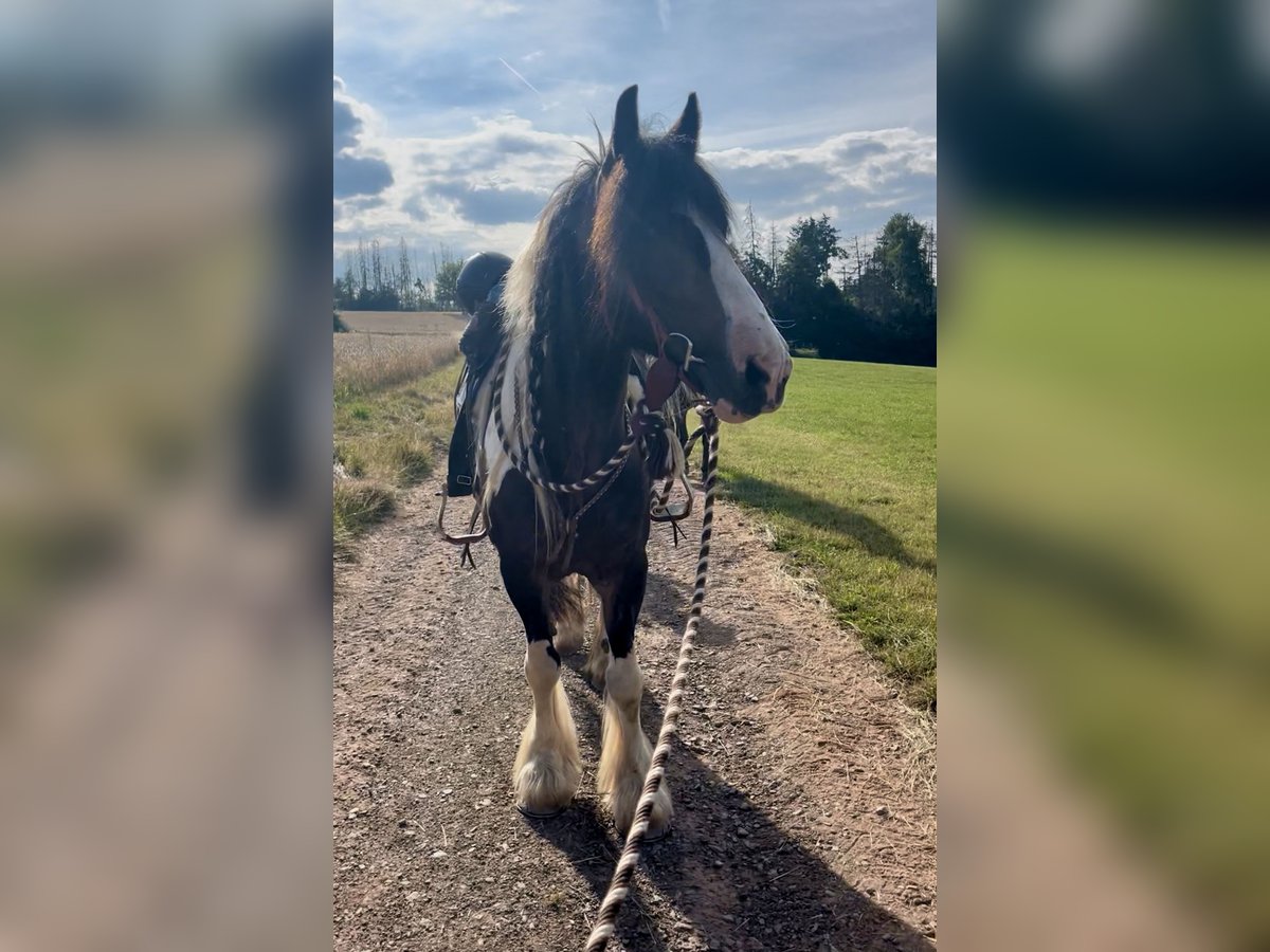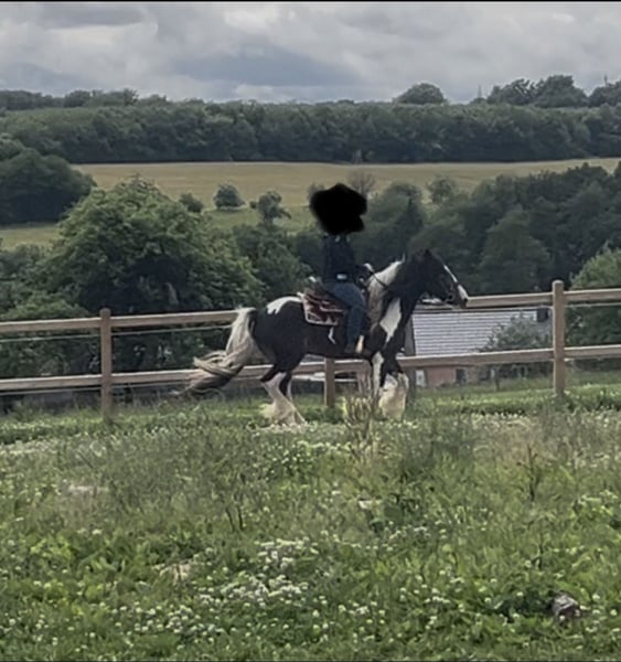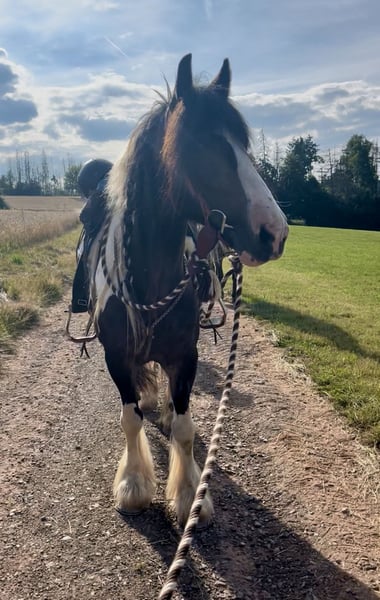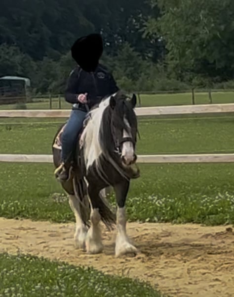 Ferry sucht einen neuen Wirkungskreis in seiner Familie Er ist 8 Jahre und ein ca.1,55 m großer, wunderschöner schwarz-weiß-braun gescheckter Tinker mit hervorragender Abstammung und ganz viel Persönlichkeit. Nun macht er sich auf die Suche nach seiner neuen Familie bei der er ankommen darf. Ferry kennt die klassische Doppellonge, die klassische Handarbeit, die Raumarbeit sowie das Führtraining. Auch die gefahrene Doppellonge ist ihm vertraut. Das Gelassenheitstraining wurde mit ihm gemacht und von ihm zuverlässig absolviert. Im Gelände ist Ferry regelmäßig unterwegs, sowohl alleine als auch mit anderen Pferden. Auch im Straßenverkehr waren wir mit ihm unterwegs, und das macht der Bub einfach nur prima: egal ob Autos, Fahrräder, Traktoren, von vorne oder von hinten, Ferry bleibt gelassen und brav. Unter dem Sattel wird er aktuell weiter ausgebildet. Er geht Schritt, Trab und Galopp und zeigt bereits schöne Ansätze von Schulterherein, Travers sowie Innen- und Außenstellung. Wie es sich für einen gestandenen Tinker und Pony gehört, kann Ferry auch mal meinungsstabil sein. Deshalb wünschen wir uns für ihn eine ebenso meinungsstabile, klare Person, die weiß, was sie will, und ihm liebevoll, aber konsequent den Rahmen gibt, den er benötigt um der treue und liebenswerte Partner zu sein, den man sich als Pferdemensch wünscht. Seine Welt ist ganz klar das Gelände, das liebt der Bub über alles. Draußen ist Ferry eine kleine Motocross-Offroad-Maschine, die einfach nur Spaß macht: überall drüber, überall durch, solange und soweit die Hufe tragen. Genau das ist seine Devise. Selbstverständlich ist Ferry schmied- und verladefromm, scheckheftgepflegt, sozialverträglich sowie an Kinder und Hunde gewöhnt. Ferry ist ein echter Kumpel, ein Draußen-Pferd, ein Typ mit Herz und Charakter. Wir wünschen uns für ihn eine Familie, die ihn so nimmt, wie er ist und Pferdeerfahrung hat. Bei Interesse bitte telefonisch oder über WhatsApp kontaktieren. 0172 4807827