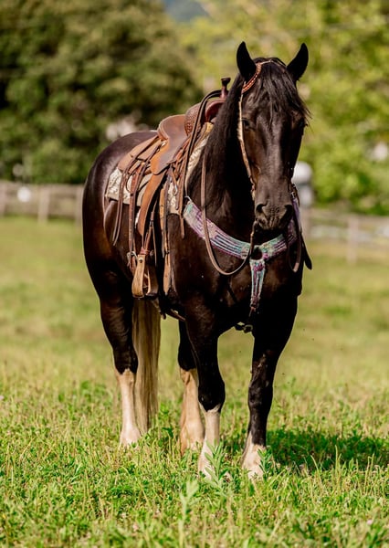 ONLINE AUCTION Place your bids at www.PlatinumEquineAuction.com Starting Bid $3500 Auction ends August 4th, 2024 Need a new saddle? Check out White Rock Saddles on our website or Facebook! DANDY’S DREAMER. Aka Amigo is a 15.2HH, 2018 Model registered Gypsy Horse (gypsy X friesian cross) gelding. Amigo is a solid and stout made horse with a lot of class and eye appeal, he’s got everything going for him, from his thick made build, to this great mind and bold colors, he’s sure to get you noticed anywhere you take him! Amigo may be pretty, but he sure has a lot more to offer than just eye appeal, Amigo classifies as a Dalmatian puppy who was VERY well socialized, he loves everyone, from the kiddos to the adults, he will be sure to try to win your heart over. Amigo may be big, but he rides sure footed and fancy moving like the small ones, he’s got a very nice flowy jog to him, and a nice big lope, with a slow going walk whether you want to hit the trails or the show ring ! Amigo is easy to catch, let me rephrase, he will catch you before you ever make it to him, he believes the best place in the pasture is right beside you ! Amigo truly believes people are his best friend, he loves being petted on and acknowledged. We’ve trail rode amigo everywhere, from big hills, to big green pastures he’s always been a solid citizen, but that’s not the best part, Amigo was originally a dude horse at the famous heart 6 ranch in Wyoming, he enjoyed toting dudes up and down the mountains and working for a living. Amigo has good solid clean legs and good feet. He will load, tie, and saddle with ease. If you’re looking for your next best friend, be sure to check amigo out, he will be sure to give you his entire heart! For more info contat Brandon Browning 859-462-1728 Located in Wallingford, KY. ONLINE AUCTION Place your bids at www.PlatinumEquineAuction.com Starting Bid $3500 Auction ends August 4th, 2024 Need a new saddle? Check out White Rock Saddles on our website or Facebook!