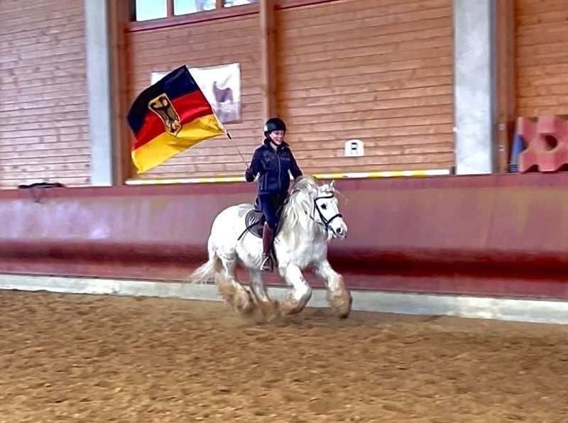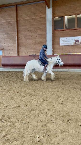 Manche Pferde wachsen einem einfach besonders ans Herz - John ist genau so einer. Geboren 2017, ca. 1,35 m groß, ein echter Irish Cob mit Charme, Charakter und ganz viel Verlässlichkeit. Wir nennen ihn liebevoll „Eisbär" , weil er mit seinem hellen Fell und ruhigen Blick einfach diese sanfte, freundliche Ausstrahlung hat. Und genau so ist er auch im Wesen: ruhig, höflich, neugierig und immer dem Menschen zugewandt. John ist im Herdenverband aufgewachsen und sozial absolut gefestigt. Im täglichen Umgang zeigt er sich vorbildlich. Er ist schmiede- und verladefromm, brav beim Putzen, Satteln und einfach angenehm in jeder Situation. Er liebt Aufmerksamkeit und genießt es, Zeit mit seinem Menschen zu verbringen. Unter dem Sattel geht er sicher in der Bahn. Er vermittelt seinem Reiter ein gutes, sicheres Gefühl und war bereits mit Kindern und Jugendlichen im Gelände unterwegs. Dort zeigt er sich als echtes Verlasspferd. Klar im Kopf, gelassen und zuverlässig. Besonders stolz sind wir auf seine Nervenstärke: Gelassenheitstraining meistert er mit einer Selbstverständlichkeit, die nicht jedes Pferd mitbringt. Die Fahne trägt er problemlos im Schritt, Trab und Galopp ruhig und konzentriert. Auch bei der Stangenarbeit ist er motiviert und aufmerksam bei der Sache. Eine aktuelle kleine AKU ohne Befund liegt selbstverständlich vor. John ist ein ehrlicher Partner fürs Leben. Für Familien, Freizeitreiter oder Kinder und Jugendliche. Ein Pferd, das Sicherheit gibt und gleichzeitig Freude macht.