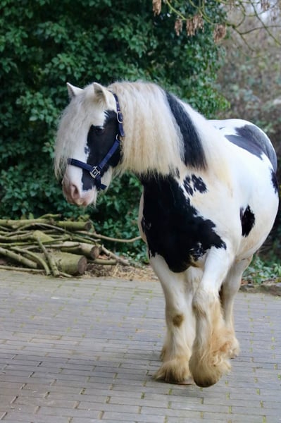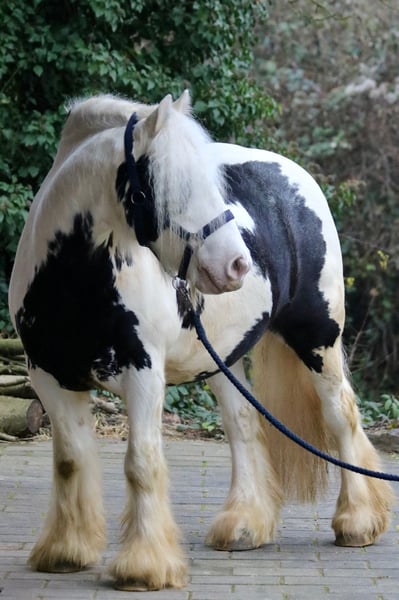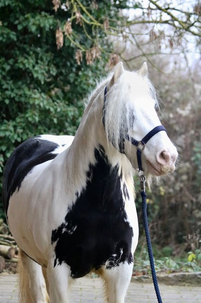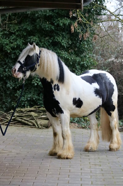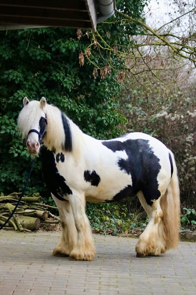 Splash, the sweetest temptation since ponies were invented. Or simply: practical, reliable, and charming. Splash is an 8-year-old, proud 14.0 hh gelding of a strikingly beautiful Gypsy Vanner breed, featuring an unusually elegant coat color, excellent conformation, and straight legs. He has been gently backed and is now in basic training. He is extremely calm, relaxed, and remains unfazed by almost anything. Whether it’s umbrellas, tarps, trumpets, or other objects, nothing startles this little fellow. Splash is already familiar with groundwork, leading, classical riding, classical double longeing, driving double longeing, and road safety training. He consistently shows attentiveness and good manners. He is also accustomed to dogs and cats. His training level is more than appropriate for a young horse of his age. He loves trail riding, whether alone or in company, and always strives to please his rider in the terrain. The boy is well-mannered and impresses with his lovable, loyal, and dependable character. Splash is completely social and used to herd life and open stable management. Naturally, he is farrier- and loading-friendly, and his health records are meticulously maintained. Thanks to his balanced temperament and composure, I can also see Splash excelling in therapeutic riding with further training. He is only available to responsible, caring owners with sufficient experience in handling young horses.