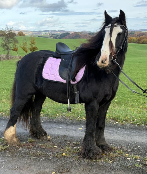 Tinker-Stute „Princess“ – brav, motiviert & ein echter Goldschatz Eckdaten: • Name: Princess • Rasse: Tinker • Alter: 12 Jahre • Stockmaß: ca. 1,45m • Preis: 5600 • AKU: vorhanden Zum Verkauf steht unsere wunderschöne, kräftige Tinker-Stute „Princess“. Sie überzeugt mit ihrem liebevollen Wesen, ihrem ausgeglichenen Charakter und ihrer ehrlichen Art – einfach ein Pferd, das man sofort ins Herz schließt. 🐴 Sie ist: – brav und absolut zuverlässig im Umgang sowie unter dem Sattel – sehr menschenbezogen, verschmust und aufmerksam – motiviert, fein an den Hilfen und lernfreudig – nervenstark und gelassen – kennt Reitplatz, Reithalle und Gelände – geht allein oder in der Gruppe souverän – auch für Kinder geeignet – ideal als Schulpferd oder Therapiepferd Mit ihrer ruhigen, freundlichen Art und ihrem großen Herzen ist Princess sowohl für Familien als auch für Einrichtungen im Reit- oder Therapiebereich eine wundervolle Partnerin. Ein echtes Herzenspferd, das jeden Tag Freude schenkt und stets zuverlässig an der Seite ihres Menschen steht. 🐎 Perfekt für: Familien, Freizeitreiter oder Einrichtungen, die ein verlässliches, menschenbezogenes und vielseitiges Pferd suchen – ob für Unterricht, Therapie oder gemütliche Ausritte. Unsere Pferde: – regelmäßig entwurmt – vom Schmied & Osteopathen betreut 🛍 Hofladen: Westernsättel, Trensen, Zubehör 🚛 Transport & Zubehör auf Wunsch günstig organisiert ✅ Unser Service: – 3 Monate Umtauschrecht – Proberitt: 35 €, jedes weitere Pferd 25 € (beim Kauf am selben Tag angerechnet) – 100 € Sofort-Rabatt bei Abholung/Transport am selben Tag – Persönliche & ehrliche Beratung 📞 Anfragen bitte nur telefonisch: 0171 – 4001968 🕗 Täglich erreichbar von 8–20 Uhr ⚠️ Keine E-Mail oder WhatsApp ⚠️ Alle Angaben ohne Gewähr