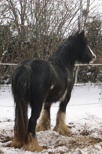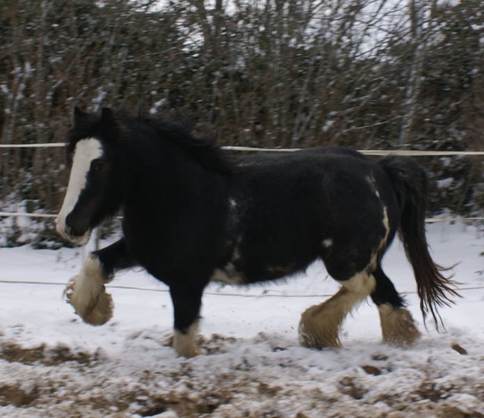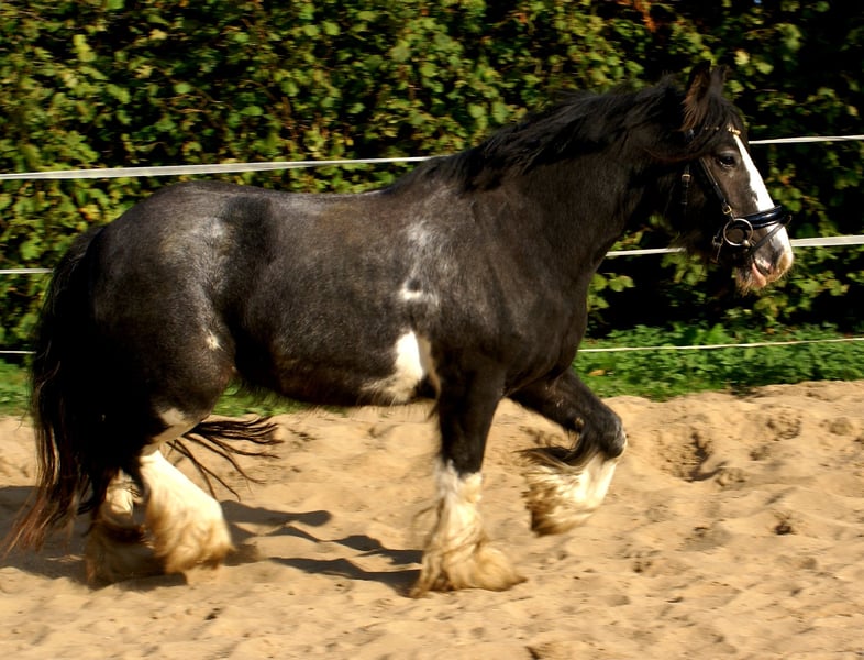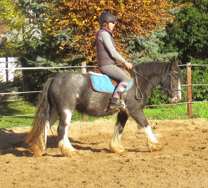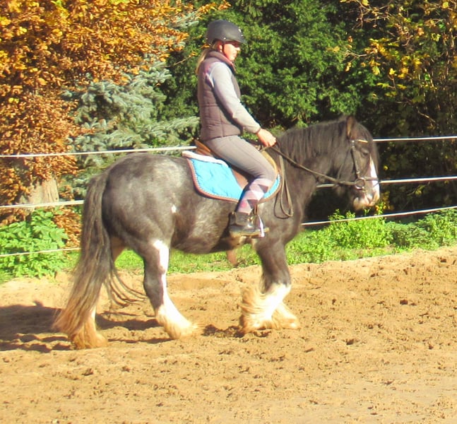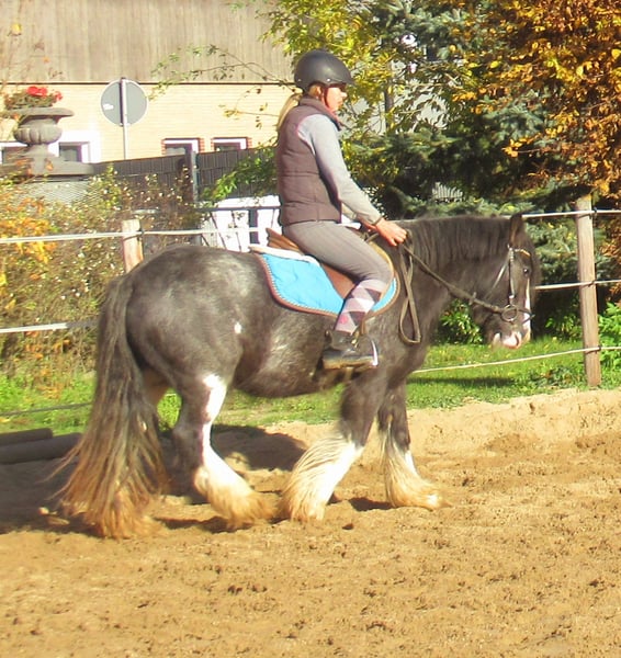 Knuffige black blagdon Tinkerstute, auffällige Optik mit schönem Exterieur, brav angeritten, hat Freude an Freispringen und springt auch mit toller Art, kennt Hunde und Traktoren, gibt brav Hufe, keine Rehe oder Mauke, artig im Umgang und unter dem Sattel