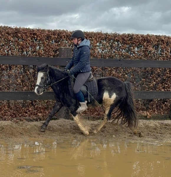 For sale is a 6-year-old, approximately 128 cm tall Tinker mix pony mare. She is somewhat more spirited than a purebred Tinker and works very well under saddle. She shows no undesirable behaviors and calmly performs all gaits on the riding arena. She also enjoys jumping and easily clears 60 cm in free jumping. She has been ridden in the field and remains calm and relaxed. In handling, she is absolutely sweet and easy to deal with. She lives in a mixed herd in an open stable and is very sociable. No known illnesses or allergies. An ultrasound examination (AKU) can be performed upon request. A trial ride, pre-ride, or other testing of the horse costs €35. This amount will be credited towards the purchase price. Please call or send a message to 0157 36803742. All information is provided without guarantee; subject to price changes. Transport is possible, online purchase available.