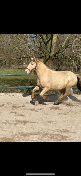 Zum Verkauf steht eine Tinker-Stute, geboren 2019, mit einem Stockmaß von ca. 1,28 m. Sie hat die auffällige Farbe Champagner und grüne Augen. Die Stute ist durchtrittig, ansonsten gesund und besitzt einen Equidenpass. Sie kennt Kinder auf dem Rücken, dies ist jedoch schon etwas länger her, da sie bereits ein Fohlen hatte. Im Umgang ist sie lieb und menschenbezogen. Sie ist schmied- und verladefromm sowie frisch entwurmt. Ich kann sie mir gut für die weitere Zucht vorstellen, ebenso – bei entsprechender Arbeit – als Kinderpony.