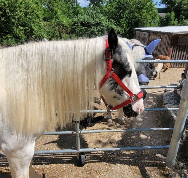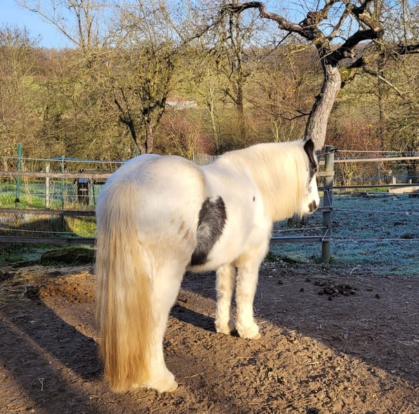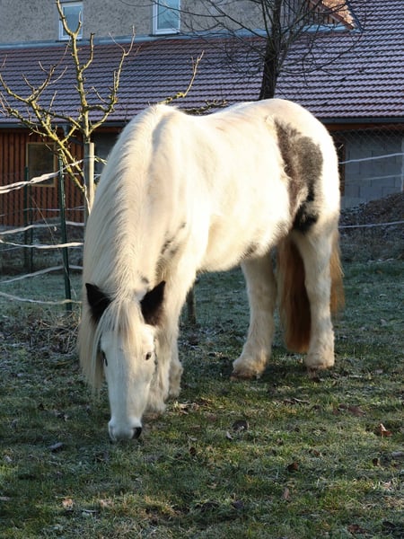 Fiona jest z nami od roku. Jest przyjazna, towarzyska i spokojna w obsłudze. Jeździliśmy na niej na placu, w terenie i w okolicy. Pracowaliśmy z nią na lonży, prowadziliśmy na spacerach, a także wykonywaliśmy ćwiczenia na ziemi i trening z kantarem. Niestety, tutaj ma zbyt mało zajęć. U poprzedniego właściciela spędziła trzy lata. Została oddana do profesjonalnego treningu westernowego w stylu Parelli (co jest dla nas nieco trudne, ponieważ jeździmy głównie na angielskim z elementami Bruns/Behr). W maju 2024 roku urodziła źrebię. Miała tam młodzieżową partnerkę do jazdy i była wykorzystywana podczas dziecięcych przejażdżek z prowadzeniem. Była także używana jako koń do trzymania, co robiła bardzo dobrze. W tamtym czasie nazywała się Tinkerbell. Fiona (Ballindown Six) posiada irski paszport (Leisure Horse Ireland), bez rodowodu, data urodzenia 1 stycznia 2018 roku. Jednak według weterynarza jest raczej o rok młodsza. Mieszka z nami razem z Highland pony i dwoma kucami Shetland. Z tego powodu dostęp do siana i czas na pastwisku są ograniczone. Nie pasuje tu do końca, potrzebowałaby więcej przestrzeni, większego padoku oraz zimowego wypasu lub paddock trail. Najlepiej, gdyby nie była w grupie z kucami Shetland. Jest zdrowa, zaszczepiona przeciwko IT, jej kopyta są pielęgnowane co 6 tygodni, a regularnie odrobaczana. Ponieważ jest jeszcze młoda i ma niewielkie doświadczenie jeździeckie, szukamy dla niej doświadczonego, konsekwentnego jeźdźca. Nie jest to koń dla początkujących.