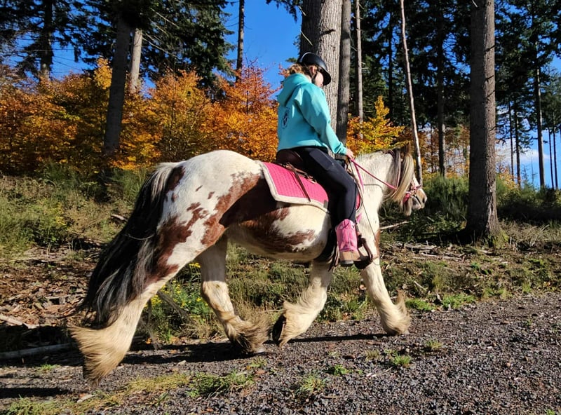 Tinker-Stute in toller Farbe Stute für Freizeit und Gelände* BABY BELL *Alter*: 9 Jahre geritten *Stockmaß*: ca. 1,44 m *Ausstattung*: E-Pass, Microchip und AKU vorhanden *Preis*: .4900 € Eine schöne Stute die sich ideal für das Gelände- und Wanderreiten eignet. Sie ist ein vielseitiges Freizeitpferd, das sowohl für englisches als auch für westliches Reiten bestens geeignet ist . Sie hat ein tolles, ausgeglichenes Wesen und fühlt sich in der Herde wohl, ist aber auch in der Box gut aufgehoben. ### *Das zeichnet sie aus:* - Offenstall- und Herdenhaltung gewohnt, Boxenhaltung ist ebenfalls kein Problem - Ideal für Freizeit- und Geländereiter - Sehr ausgeglichen und unkompliziert im Umgang *Interesse?* Rufen Sie uns gerne an unter *0171-4001968* (täglich von 8–20 Uhr). *Bitte keine Mails oder WhatsApp, nur Anrufe!* *Zusätzliche Informationen:* - Zubehör und Transport können günstig organisiert werden. - Unser Hofladen bietet eine kleine Auswahl an gebrauchten Westernsätteln. - *Ratenzahlung ist nicht möglich.* *Service für Kunden:* - Jeder Kunde erhält ein vertraglich festgesetztes *Umtauschrecht von drei Monaten.* - Ein Proberitt bei uns ist möglich, damit Sie Ihr Traumpferd kennenlernen können. Für 35 Euro können Sie reiten, sich ihn vorreiten lassen, spazieren gehen oder mehr. Auf Wunsch können Sie auch ein zweites Pferd testen für 25,- . Dieser Betrag wird beim Kauf eines Pferdes am gleichen Tag selbstverständlich verrechnet. *Besonderheiten:* - Bei sofortiger Abholung mit Pferdeanhänger erhalten Sie *einen Nachlass von 100 Euro.* - Wir absolvieren den Verkauf mit einem transparenten Proberitt, um sicherzustellen, dass es das richtige Pferd für Sie ist. *Rechtliches:* - Wir sind alleinige und uneingeschränkte Eigentümer der Bilder; die Bildrechte liegen bei uns. *Fremdverwendung der Bilder ist verboten.* - Bitte beachten Sie, dass es sich um ein lebendes Pferd handelt. Unsere Angaben basieren auf den Eindrücken des Betreuers und stellen keine zugesicherten Eigenschaften dar. - Anzeigen werden sofort gelöscht, sobald die Pferde verkauft sind. *Interesse?* Rufen Sie uns gerne an unter *0171-4001968* (täglich von 8–20 Uhr). *Bitte keine Mails oder WhatsApp, nur Anrufe!