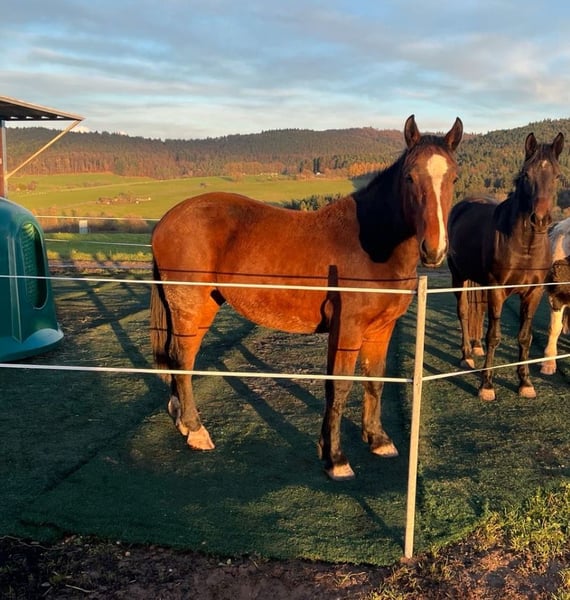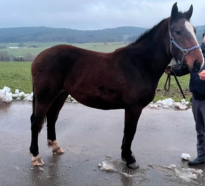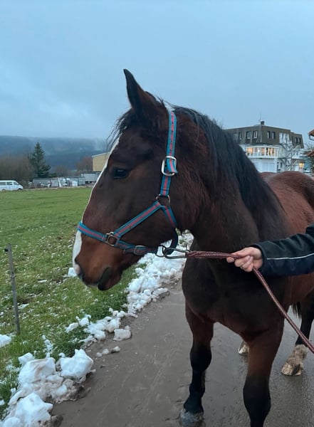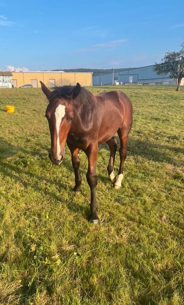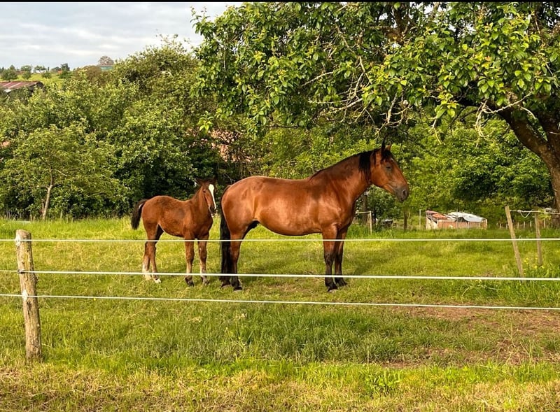 Aufgrund familiärer Veränderungen suchen wir für unsere 2 jährige süddeutsche Kaltblutstute ein neues Zuhause. Sie ist im März 2024 bei uns geboren und seitdem auf großen Weiden und im Offenstall in der Herde aufgewachsen. Seit dem Absetzen steht sie mit anderen Jungpferden bei uns zusammen. Sie ist dem Menschen sehr zugewandt und sehr neugierig, kennt Halfter, Schmied und Hängerfahren. Sie wurde natürlich regelmäßig entwurmt und geimpft. Abstammung: siehe Fotos Das letzte Bild zeigt den Vater. Aktuelles Stockmaß ca 1,55m. Die Mutter hat 1,65m. Bei Interesse könnte die Mutter (2020 geboren) mit erworben werden. Mutter wird aber nicht alleine verkauft. Privatverkauf