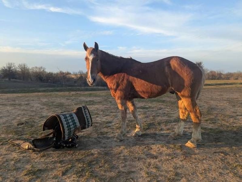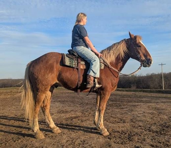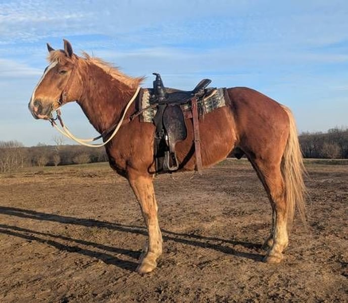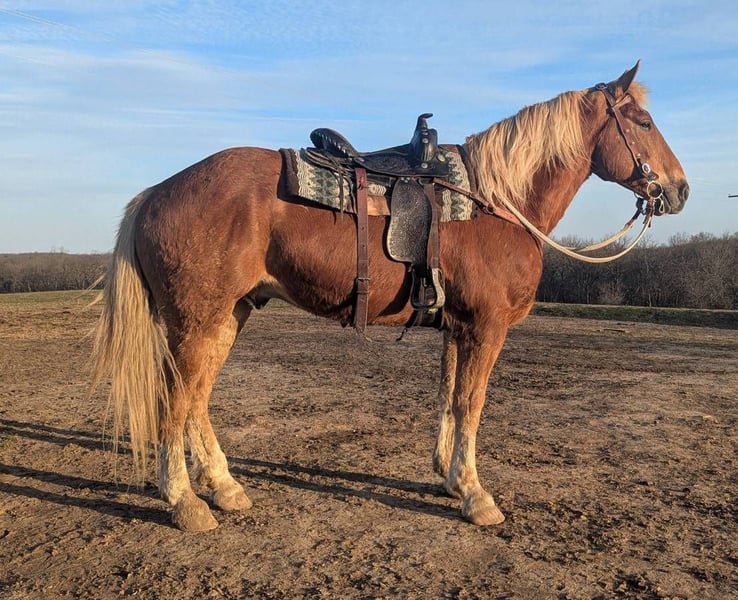 Standing at 16.1 and his strong build, he gets attention everywhere he goes! This sweet guy is broke to ride and drive! He is an amazing trail horse. He will willingly go anywhere asked with zero issues. Kid safe and a joy for the whole family. You can walk up to him in the pasture. He's good to be with other horses or take off by himself. He's also traffic safe. He has a nice smooth trot and lope, ESPECIALLY for a draft cross. He has been through our obstacle course and is exposed to almost any farm animal out there. I would have no issues putting a beginner rider on him and leading them around on him. He loves being groomed and spoiled! He has already been wormed this spring. We are located near Lawson, MO. Come out and ride him for yourself and see what you think. We put together a very detailed video, if you would like to see it or if you have any other questions call or text: 660-973-0264