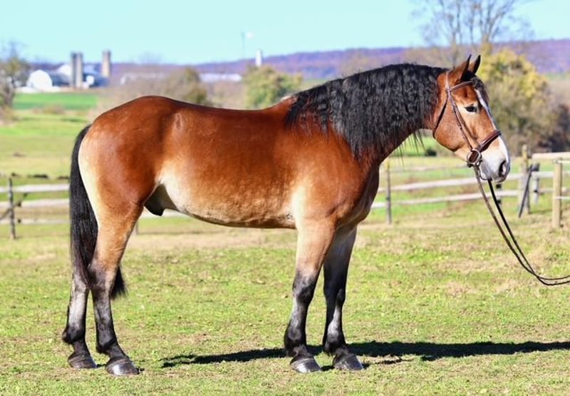 "AVAILABLE ON ONLINE HORSE AUCTION AT www.MagicHorseAuction.com BIDDING OPEN NOW thru TUESDAY | FEBRUARY 3RD! BUY IT NOW AVAILABLE! *Final price will be determined on auction site* CONSIGNOR CONTACT INFO: Juli Hubik #717-875-2061 LOCATION: Gap, PA 17527 " "Meet ✨Waylon’s Iron✨ (aka Wayne)💪🏽 This outstanding gelding is a five-year-old Belgian/Morgan cross, standing right around 16 hands. With a bold blaze, pretty coloring, and good conformation, he gets noticed everywhere he goes. Wayne rides English, Western, lays down on command, and drives! He’s as handy as they come and doesn’t mind a full day of work — in fact, he seems to thrive on it. He’s had enough miles under his belt to be reliable and sensible. Wayne is an absolute hunk, he’s built sturdy, and he’s built to last. Wayne has been well educated and has quite a few buttons! He spins, side passes, leg yields, and turns on the haunches. He’s adjustable with just a light feel through your hand and leg. He’s a smart ride and so fun to bring along — making him enjoyable for riders with some experience. In the arena, he’s probably not suitable for a complete beginner yet, simply because he is still learning himself. However, we could see him being a great fit for a confident AA or JR working with a trainer, or a professional who wants a smart young horse to make into something great. He tends to have more of a “mosey along” attitude on the trail, so in that scenario, he could definitely have the husband thrown on for a fun ride out. In the arena, he has a good work ethic — a nice in-between of having his own motor while still having brakes and adjustability. He is very sensible, though not a complete deadhead, and still just a baby learning the ropes. He has a lot of confidence across a variety of disciplines and offers a great feel under saddle. This pretty gelding neck reins as well as direct reins, he’s learning to go on the bit, and he already moves off of leg extremely well. He’s the kind you can put plenty of leg on without him launching you into space or trying to be a racehorse. He reads his rider’s body language very well for his age and is responsive to your seat, posting speed, a half halt, or a slight wiggle of the rein to bend, etc. He sometimes needs to be reminded to slow down his brain, because he always wants to please and do the right thing, which can lead to some anticipation. He’s a horse that will do well with someone who can keep things interesting for him and give him a job. He doesn’t mind a hard day of work, and we could see him being great for a ranch outfit, someone who does lots of trails, fox hunting, hunter paces, or even someone who wants to turn him into a dressage master! The options are truly endless for him, and he has potential in every way. He is loaded with talent, and we want him to go to the perfect fit! Over jumps, Wayne has been started slowly and correctly, and he has been exposed to a variety of different environments. He’s the same horse off property as he is at home. He’s been out on hunter paces and cross-country schooling, and this guy totally blew us away with his natural talent. He’s guaranteed to get you to the other side of the jump and is always the type to go for it with cute form and his ears forward! He’s been over poles, cross rails, boxes, and oxers in the ring, as well as logs, roll tops, coops, and tubes out on the trail and cross country. He’s started doing simple combinations and exercises and is doing fantastic! He hasn’t had his legs jumped off, and his introduction to jumping has been slow and focused on the basics. Out in the field, he will follow or lead over jumps without hesitation. Wayne is one that will get better every single time you practice and blow you away with his honesty and natural talent. On the trail, Wayne is happy to go wherever you put him. He doesn’t get too forward or hot, and you can walk him on a loose rein. He’s like a small, compact semi-truck that will go through or over anything! He will lead the way through swampy, muddy creeks or go in the river for a dip. He’s been over bridges, out in open fields, on wooded, winding trails, and exposed to hikers, bikers, and all sorts of wildlife. He is traffic-safe and equipment-proof. We’ve ridden him into town, right past live construction sites, and he didn’t bat an eye. He’s been to the store, the gas station, and has even gone through the drive-thru! He has a good brain, is surefooted, and is the same horse every time you take him out. He’s just as unfaltering under harness and is used to being hitched up solo and taken out. He’s light to drive through your hands and responds to voice signals. In the barn, Wayne has good manners and is respectful and obedient. He has zero vices in the barn, in turnout, or in his stall. He’s a gentleman to groom, tack up, and bathe, and he’s always a sweetheart for the farrier and vet. He’s in your pocket with a people-loving personality and will stand for hours to get attention and be doted over. He loads right into the trailer with no issues or hesitation — and trailers quiet as a mouse. This is a fantastic young prospect with all the potential to continue in any direction. If you want a handy horse with a good work ethic and a will to please, Wayne is your boy! UTD on shots, farrier, Coggins, dentist, and deworming. "