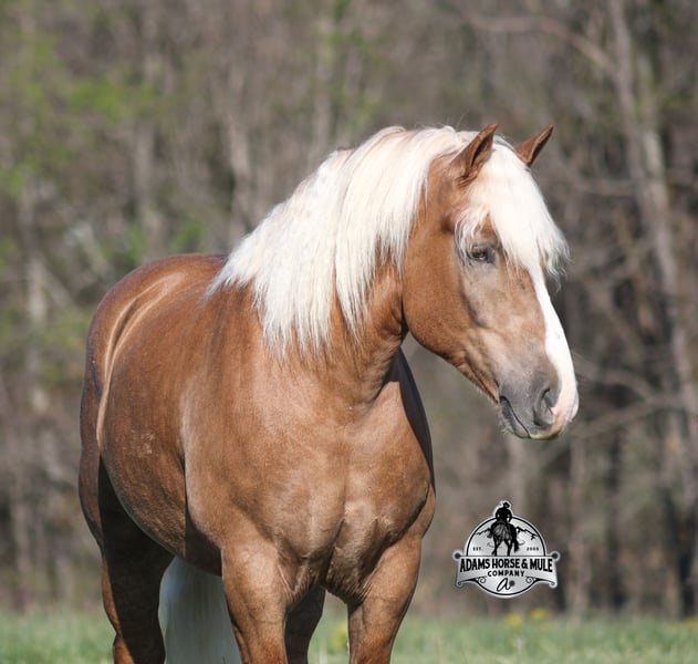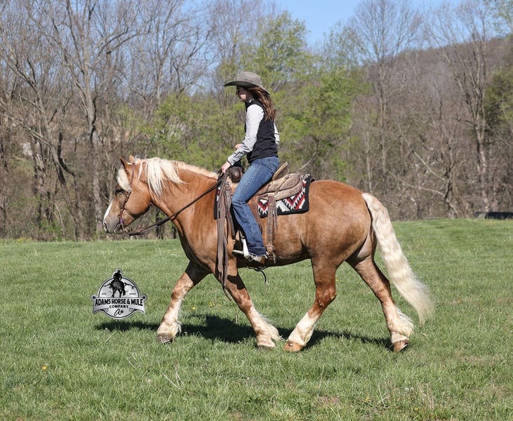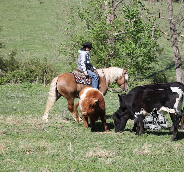 Go to visit our website for more pics and video link at www.AdamsHorseAndMuleCo.com AHAMC has been in the horse business and sold horses over the internet since 2005. We have a long track record of success with hundreds of happy customers. We work hard to match riders with the correct horses and specialize in beginner safe, family friendly horses that have been used and checked out by our family! We can set up transportation anywhere in the US and look forward to working with you. If your confidence levels are low and you have had nothing but bad luck with you other horses… just say goodbye to those days because your new Buddy is here! Buddy is a beautiful Golden Palomino/Blonde Sorrel Gelding that is very stocky built, he is 6 years old, is standing 15.2hh and he is a looker! He is a draftcross horse that has completed the natural horsemanship program, is very friendly and loves attention!! He knows some tricks as well as he will lay down on command. Buddy has done it all from being ridden by small children down the highways to being ridden around the ranch, checked cows, rode fences and cruised the trails. He has been used at brandings and drug calves to the fire. He is a laid back type of guy that will just plod along down the trails with no hesitation and not in a hurry. He has been on camping trips and has been ridden by all ages of riders from 6 to 86 that guy will be safe and easy to ride. When out on the ranch or going down the trails he will cross creeks, ditches, logs and navigate rough, rocky areas. He is safe in traffic whether that be trucks or cars. He walks on a loose rein, has a nice jog, his lope is slow and collected plus he lopes very nice circles on a loose/draped rein! Buddy is a great horse for the whole family! He has been exposed to all kinds of wildlife such as deer or turkey. He is athletic and does great under English tack and goes over the rails with ease. He is harness broke for all farm machinery and buggies. Buddy is one that the whole family will love, he will be perfect for the guest to ride as he will build his riders confidence, with a personality that will make him everyone’s best friend! Feel free to call Eric 606-308-2461 with any questions!